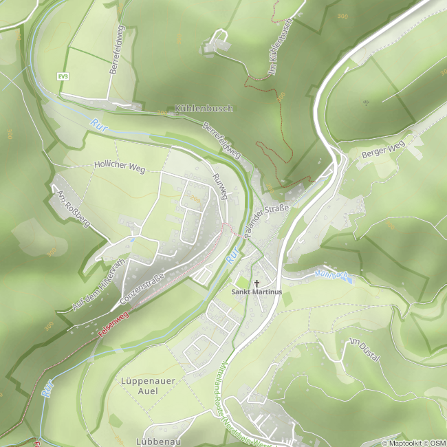 Entlang alter Fachwerkhäuser verlassen wird das urige Eifeldorf Abenden. Vorbei an den Auen der Rur kommen wir schließlich zu einer Abzweigung, welche uns in eine Welt uralter Felsen führt.