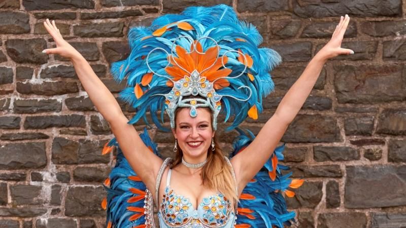 • Eine fröhliche Tänzerin mit buntem Federkostüm steht vor einer Steinmauer. Sie hebt die Arme und lächelt, während sie ihre lebhaften Accessoires präsentiert.