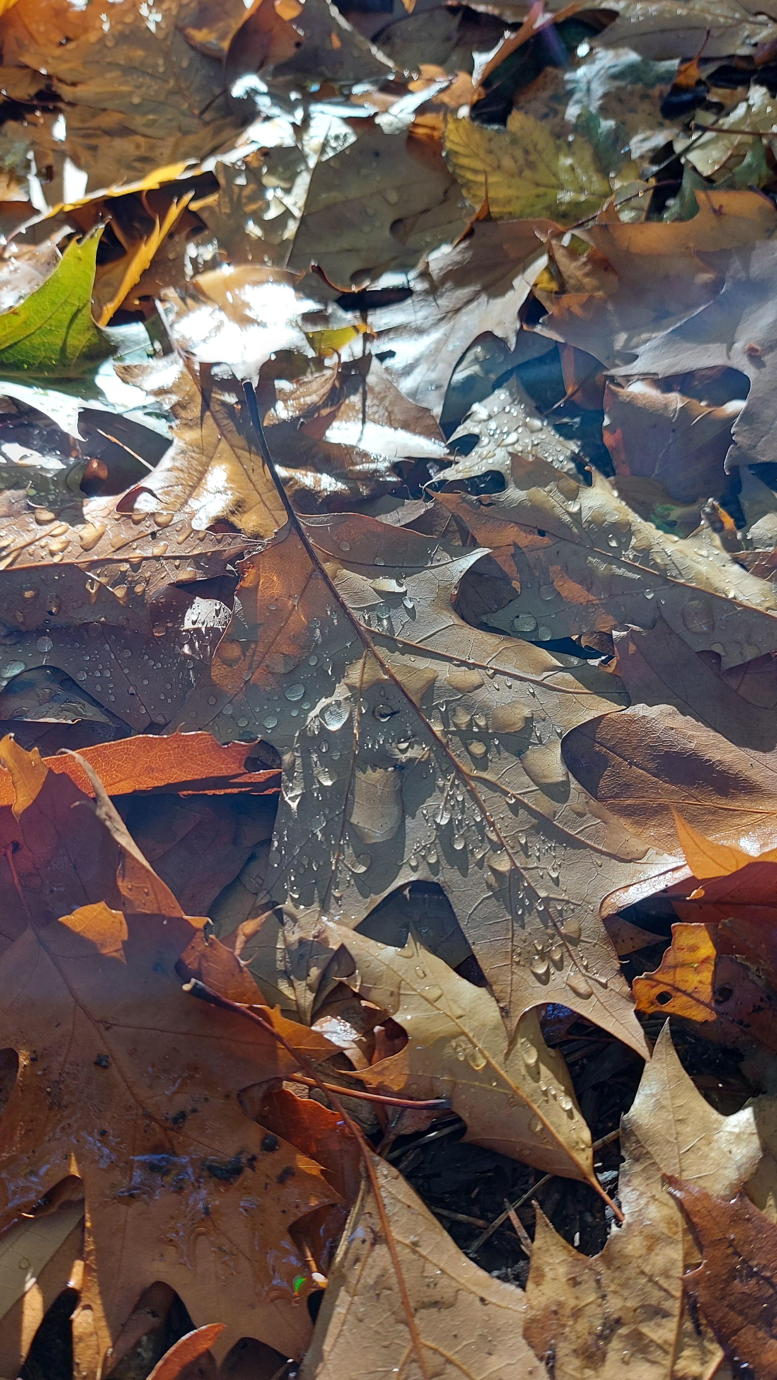 • Ein Boden voller bunter Herbstblätter, bedeckt mit Wassertropfen. Die Blätter sind in verschiedenen Farben, von orange bis braun.