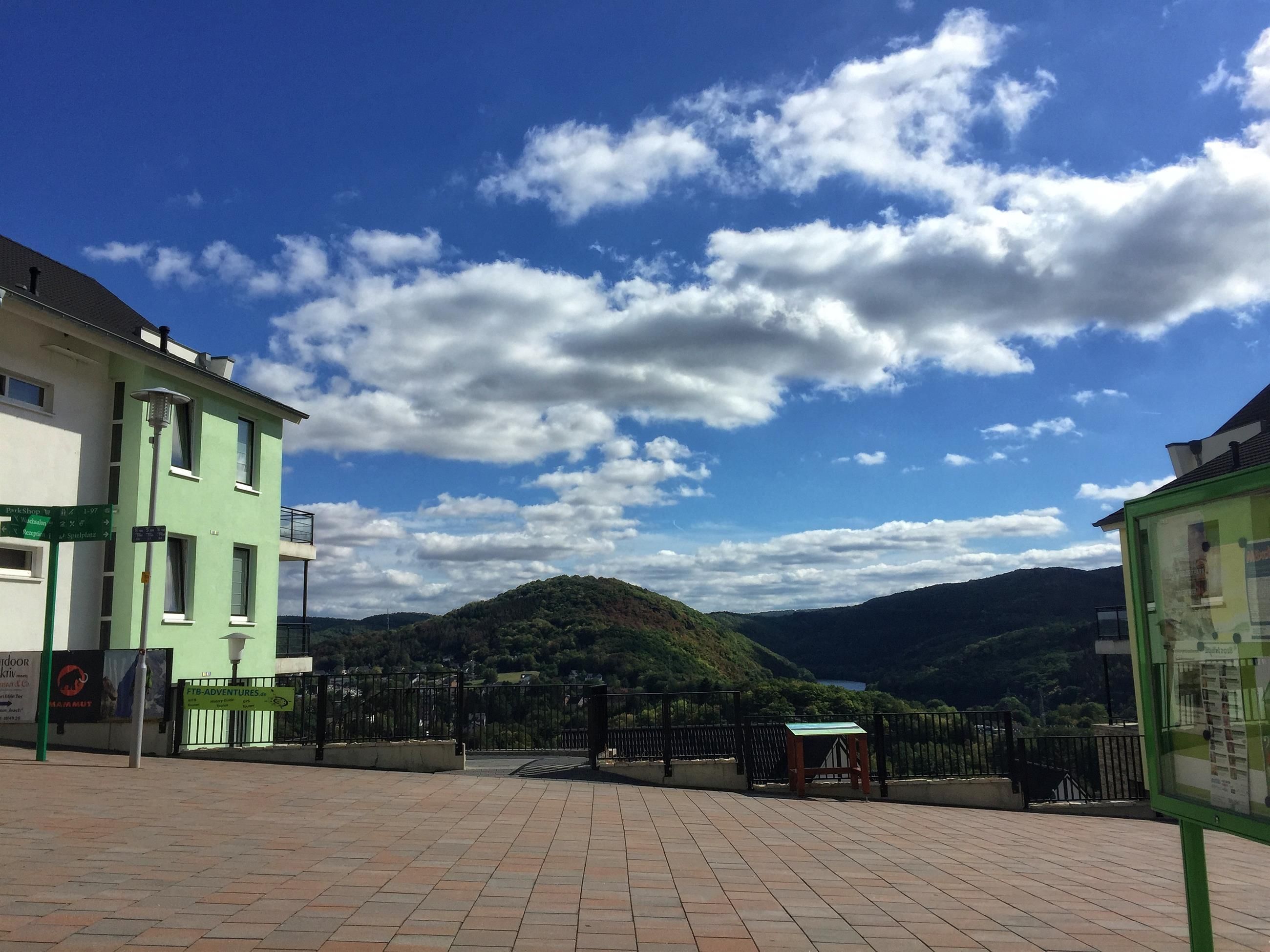 Dieser Eifel-Blick befindet sich auf der Promenade des seit 2014 eröffneten Landal Resort "Eifeler Tor". Er bietet einen wundervollen Blick auf das Rurtal sowie über Heimbach-Hasenfeld.