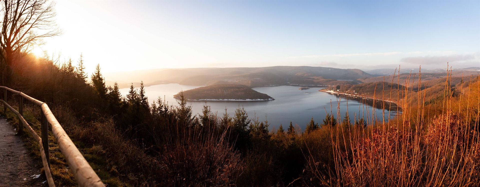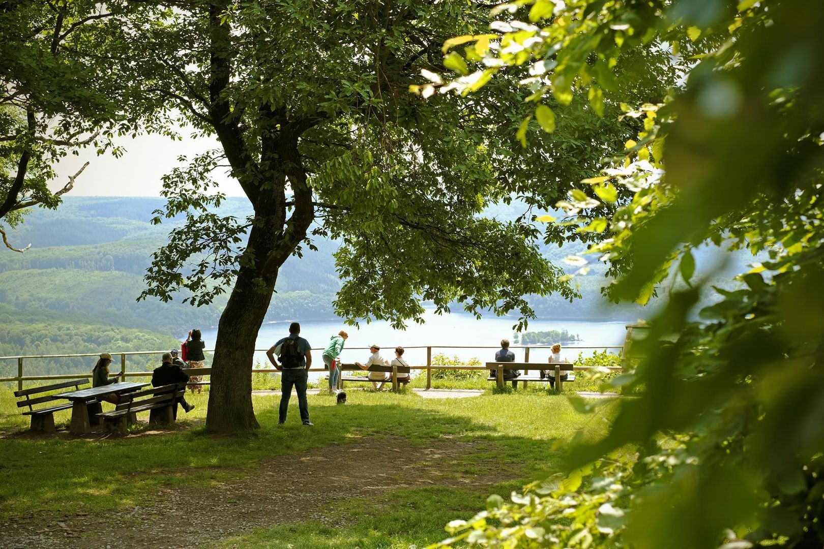 Der Eifel-Blick "Schöne Aussicht" auf der "Simonsley" (415 Meter über dem Meeresspiegel) bietet Ihnen oberhalb des Rursees in südost- bis südwestlicher Richtung einen beeindruckendes Panorama, wobei der "Kermeter", ein Kernbereich im Nationalpark Eifel, die Blicke auf sich zieht.