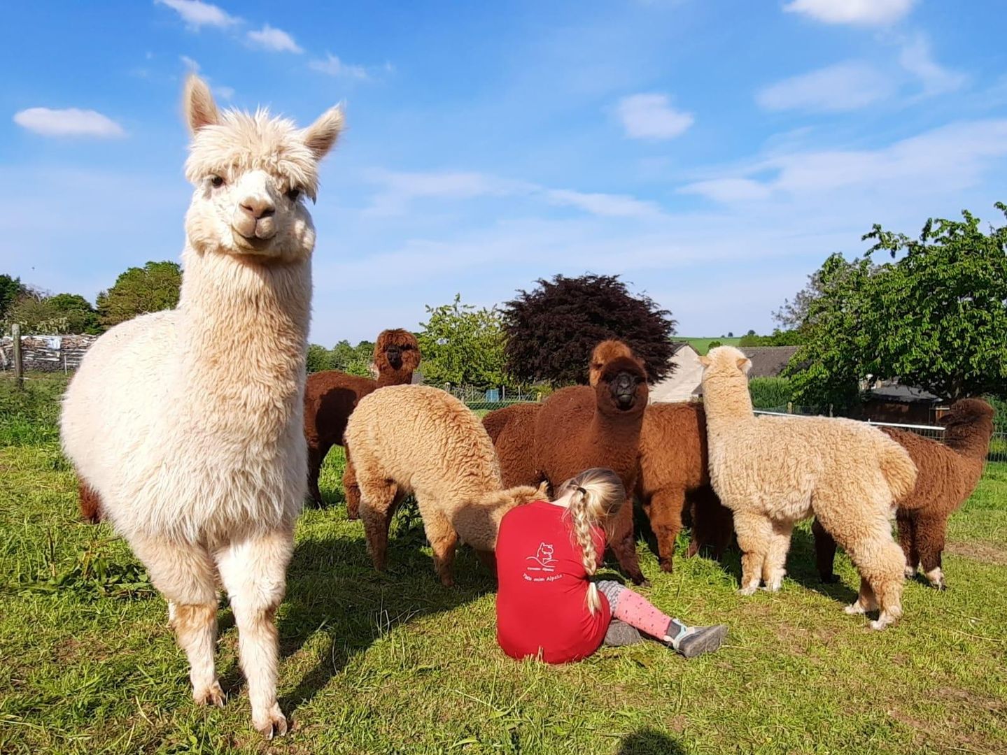 Wer den sanftmütigen Alpakas einmal ganz nah sein möchte, kann diese faszinierenden Tiere bei uns erleben. Bei einer zweistündigen Alpaka-Wanderung erlebst du die unbeschwerte Natur und entdeckst die Langsamkeit neu. Die frische Luft, leicht hügelige Landschaft und freien Blick über Land und Flur verspricht ein harmonisches Erlebnis zu werden. Für Familien bieten wir unsere Alpaka-Esel-Erlebnisse an. Wer nicht wandern mag, sondern eine entspannte Zeit mit der Alpakaherde auf der Wiese verbringen möchte, kann die Alpakas bei der Alpaka-Wiesenzeit auf ihrer Wiese besuchen. Erlebe die neugierigen Wesen mit ihrer ruhigen Art in der Herde. Ein selbst mitgebrachtes Picknick kann auf unseren Sitzmöglichkeiten verzehrt werden. Natürlich lassen sich Alpakas gerne fotografieren und fühlen sich vor der Kamera wohl. Die kleinen Stars zeigen gerne ihre liebevollen und mal lustigen Grimassen. Alpakas machen tierisch Spaß! Wir freuen uns auf deinen Besuch!