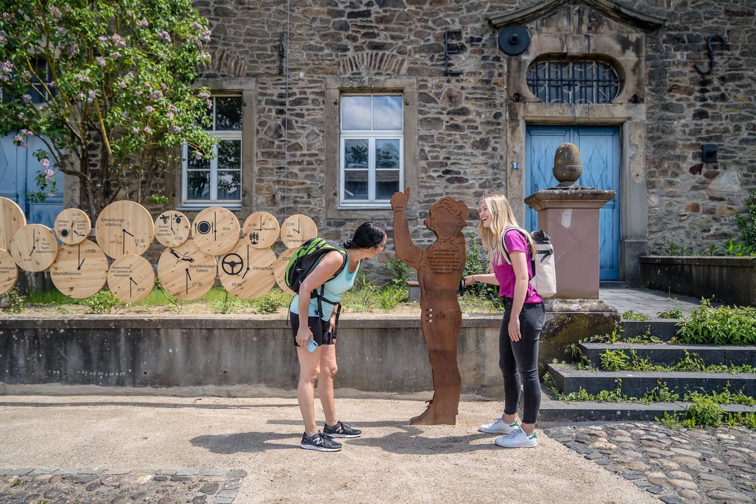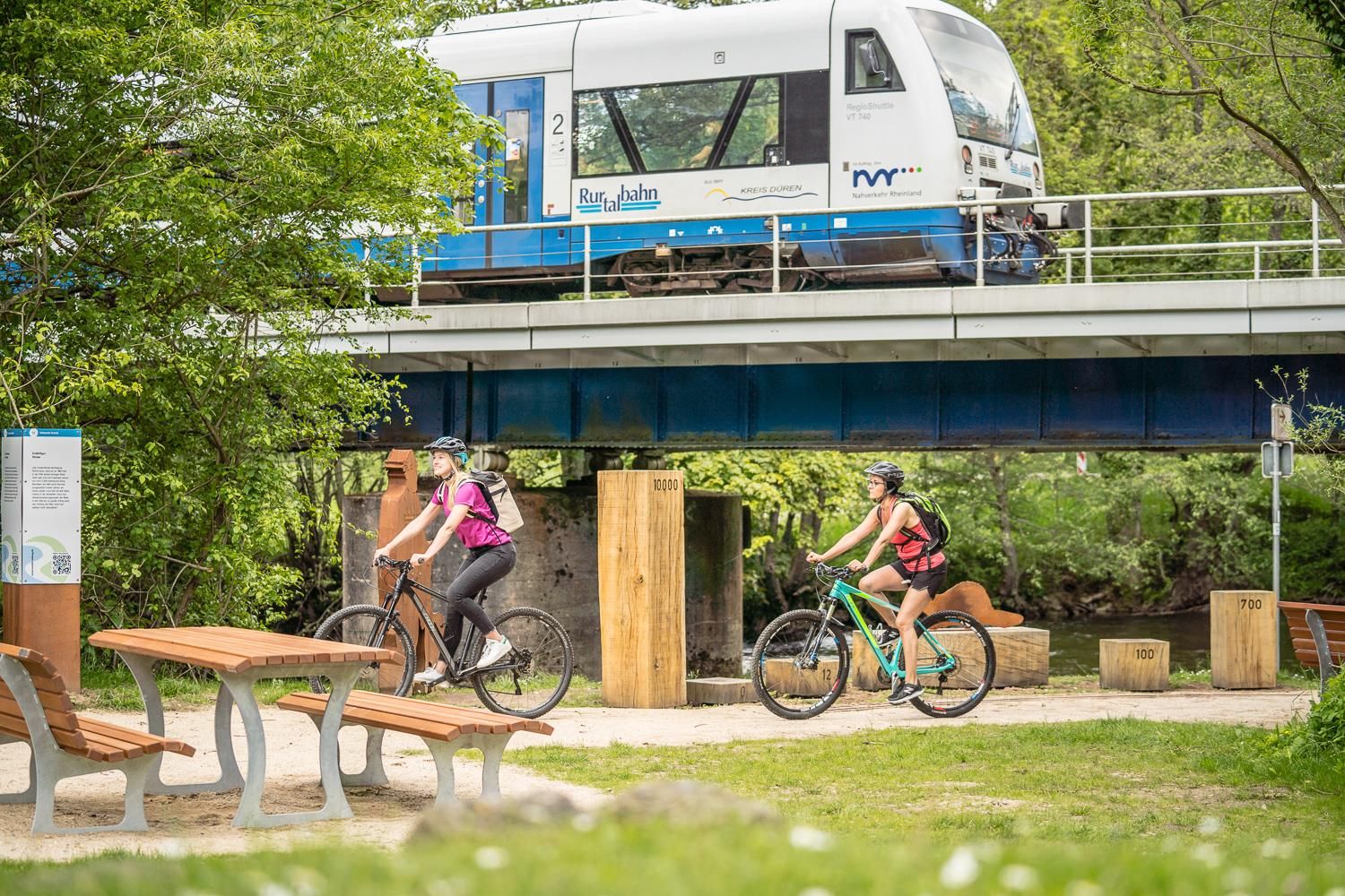Begleiten Sie die Rur auf dem RurUfer-Radweg durch den Kreis Düren, und erfahren Sie, wie sich das Leben in der Region und die Landschaft über die Jahrhunderte verändert haben. An insgesamt 18 Rast- und Erlebnisstationen, davon 8 im Kreis Düren, berichten Ihnen Erzählfiguren anschaulich, wie beispielsweise der Strom in die Eifel kam, warum Hermine Hoesch die Geschicke des Unternehmens anstelle ihres Mannes leitete, wie Düren zum "Mekka" der Papierindustrie geworden ist und welche Veränderungen der Tagebau für die dort ansässigen Familien mit sich brachte.