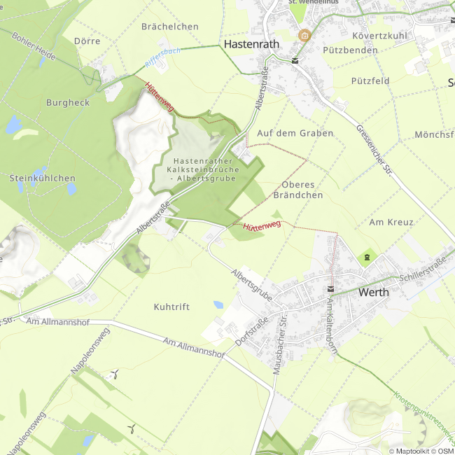 An dieser Stelle befindet sich der sogenannte Maschinenschacht der Albertsgrube. Im Hintergrund sind noch Fundamentreste des Grubenhauses zu sehen, in dem sich die Dampfmaschine befand, mit der Förderung und Wasserhaltung betrieben wurden. Der eigentliche Schacht befindet sich ca. 5 m links davon. Von hier aus wurden die 60 m, die 90 m, die 110 m, die 120 m, die 130 m und die 138 m Sohle der Grube aufgefahren. Der Großteil der Entwässerung erfolgte wohl über die 60 m Sohle, die über den „Tiefen Stollen“ noch heute in den Quellbach entwässert. Die Albertsgrube wurde 1838 als Konzession auf Blei, Zink und Eisen von Albert Ostländer (Werth) und der Witwe J.W. Heinen (Hastenrath) beantragt und 1840 genehmigt. Ostländer firmierte mit seinem Vornamen als Namensgeber der Grube. Aufgefahren wurde die Albertsgrube über den „Tiefen Stollen“ am 14.04.1840. 1859 wurde die Grube auf 7 Gänge ausgebaut, und der Maschinenschacht entwickelte sich zum zentralen Schacht der Grube. Bereits 1910 müssen diese Erzvorkommen erschöpft gewesen sein, da danach bis zur Schließung der Grube 1917 nur noch im Bereich Kuckucksgang abgebaut wurde. Alle oberirdischen Gebäude wurden bis 1919 abgebrochen. Zum Zustand der Verfüllung der Schächte, inklusive des Maschinenschachts, existieren keine Unterlagen. Mündliche Überlieferungen bezeugen die Nutzung der damals teilweise noch offen liegenden Schächte als Mülldeponien bis nach dem zweiten Weltkrieg. Einzig einige wenige Hinweise zu Strafbescheiden von 1923 wegen nicht verfüllter Schächte konnten bislang ausfindig gemacht werden. Der „Tiefe Stollen“ wurde 2019 auf Beschluss des Bergamts mit Beton verfüllt.