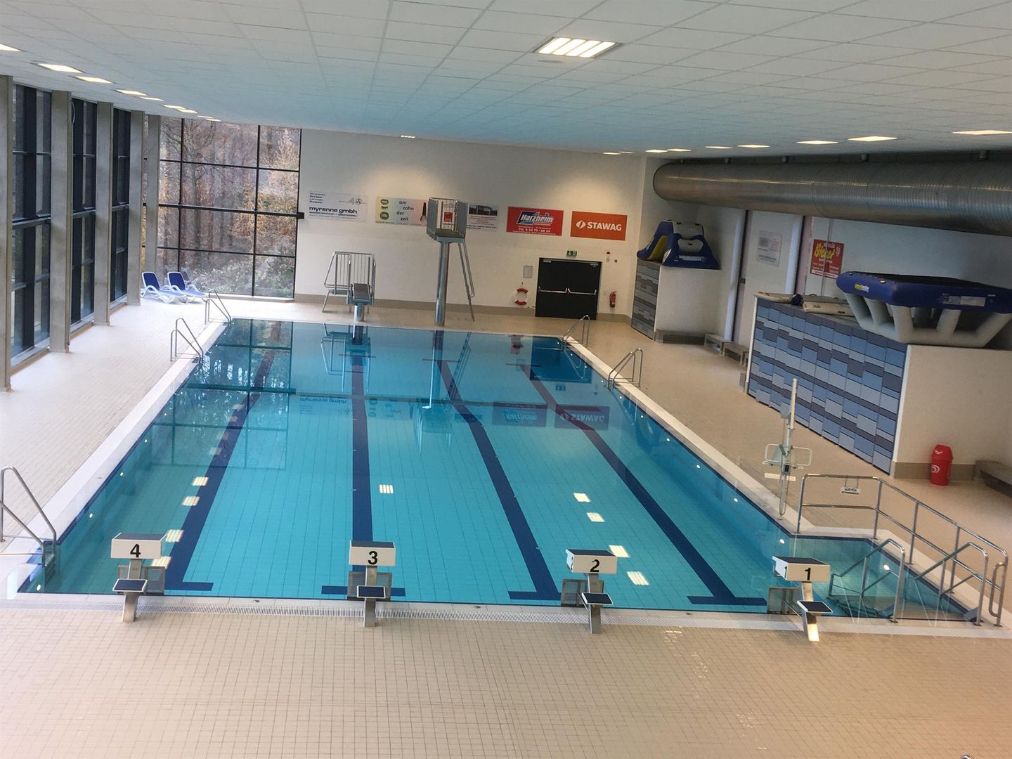 Bei 28,5 Grad Wassertemperatur bietet das 25 Meter-Becken mit Sprungbrett und Drei-Meter-Turm 4 Bahnen. Lehrschwimmbecken und Kinderbecken sind auch vorhanden.