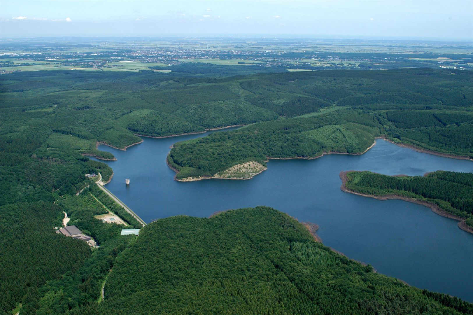 Beeindruckend auch noch heute: Die frühere Landstraße Nummer 11 zwischen Kleinhau und Schevenhütte verläuft quer durch die Wehebachtalsperre und wurde durch die Stauung des Wehebachtals unpassierbar.