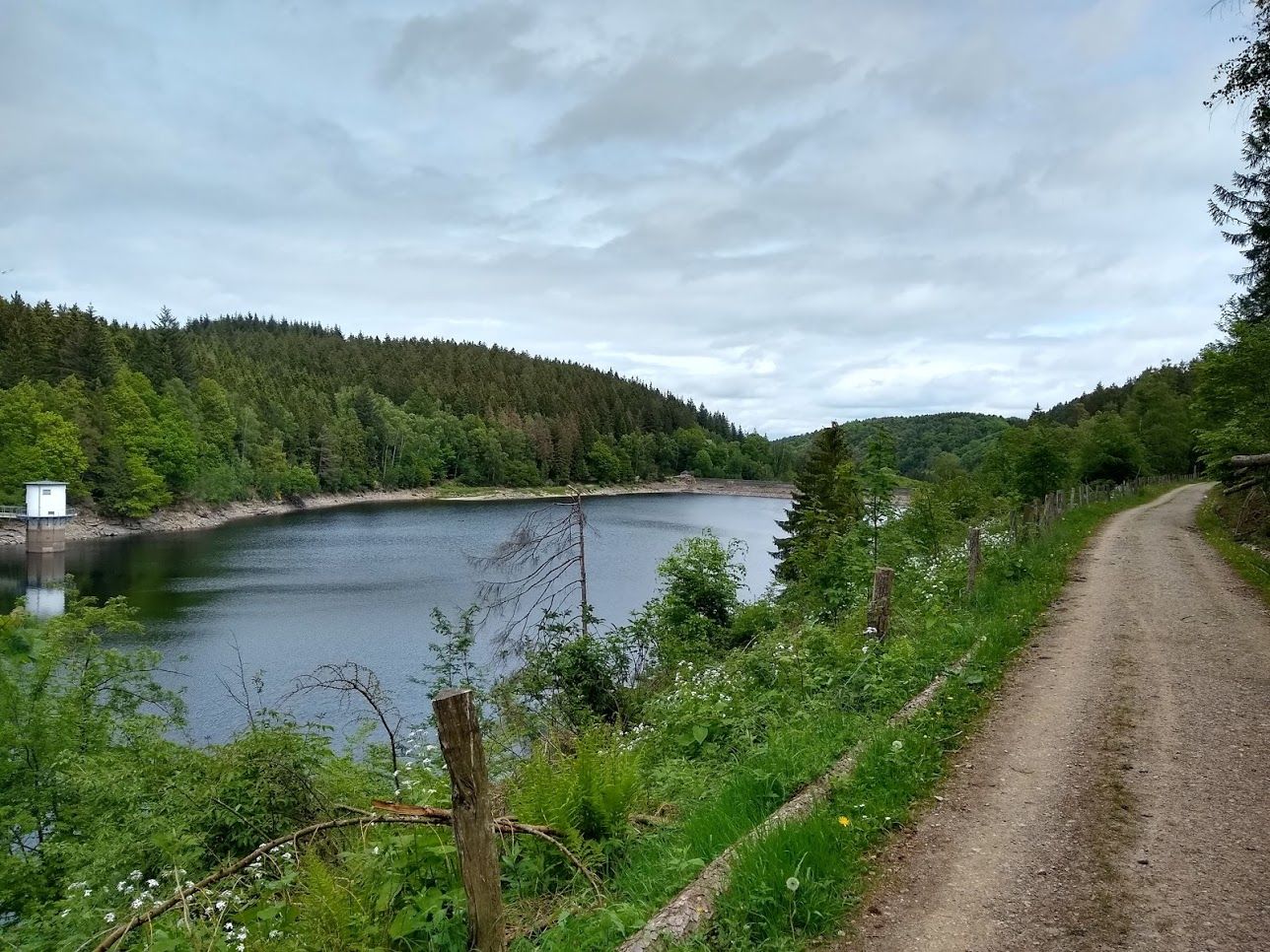 Der Weg taucht ein in den Simmerather Wald und schlängelt sich Richtung Kalltalsperre. Dabei treffen wir mit Kelzerbach und Saarcher Bach auf zwei für die Eifellandschaft typische quirlige Bäche. Nach wenigen Kilometern kommt dann die Kalltalsperre in Sicht und der Weg führt uns am Südufer der Talsperre entlang.