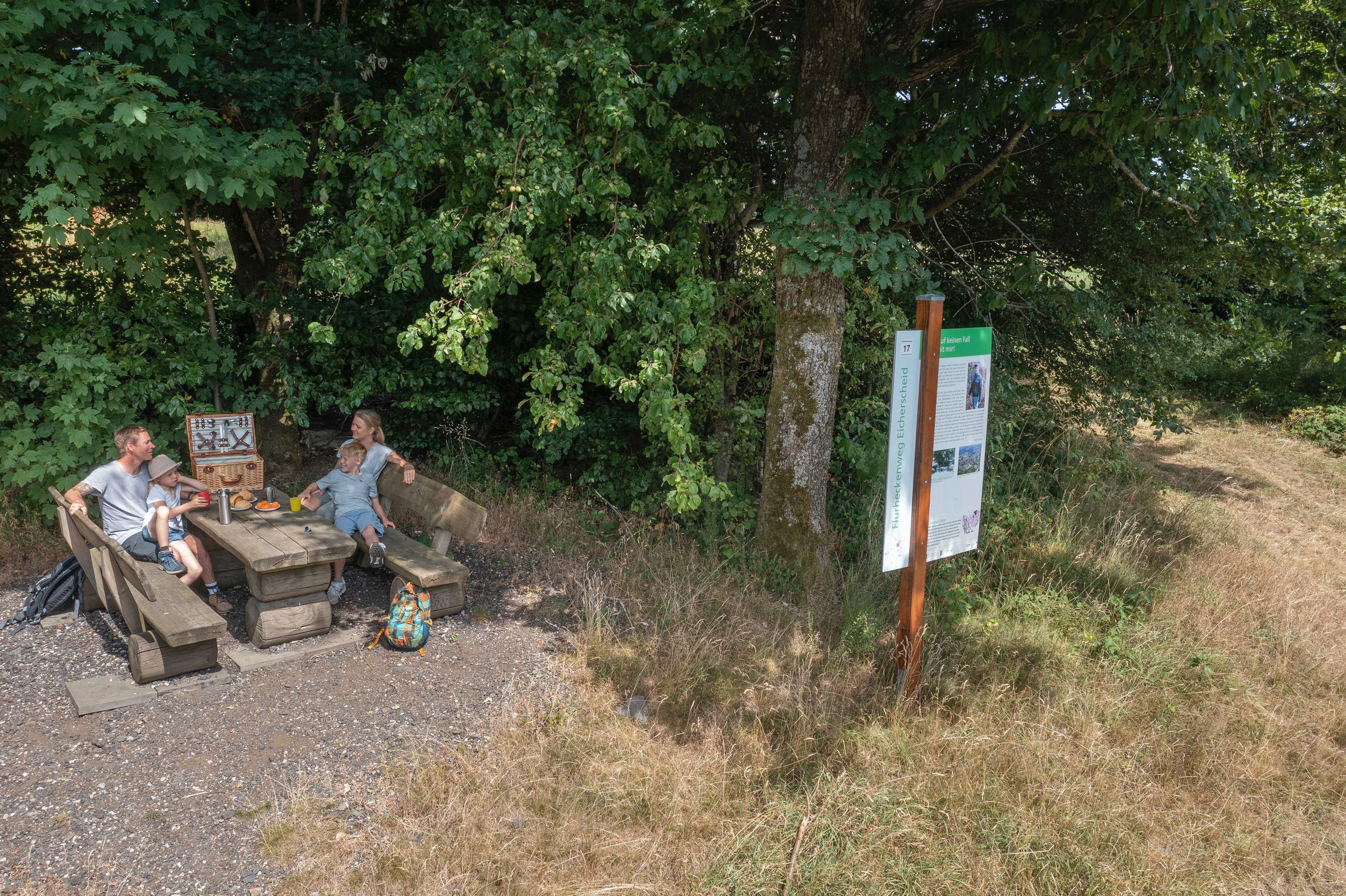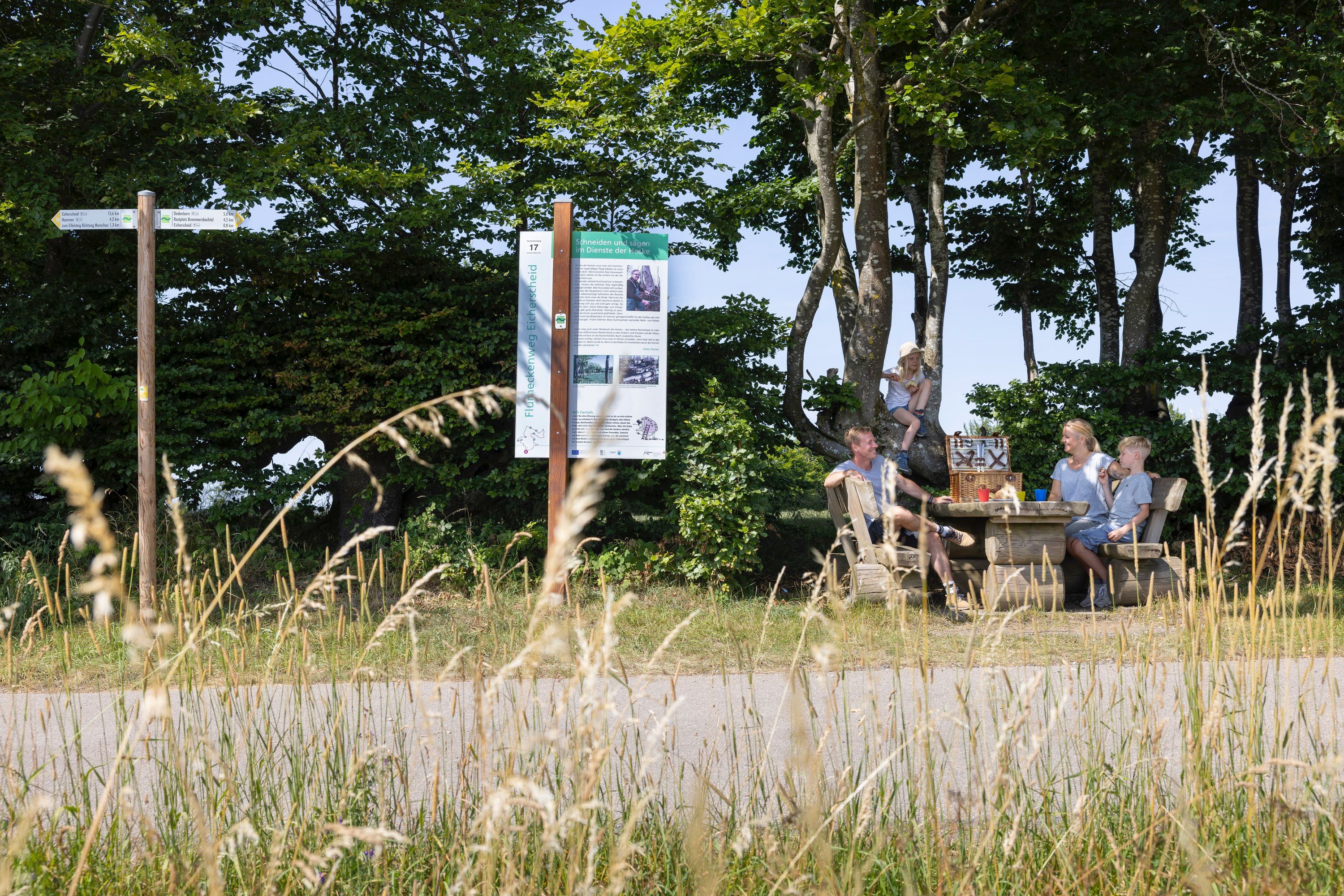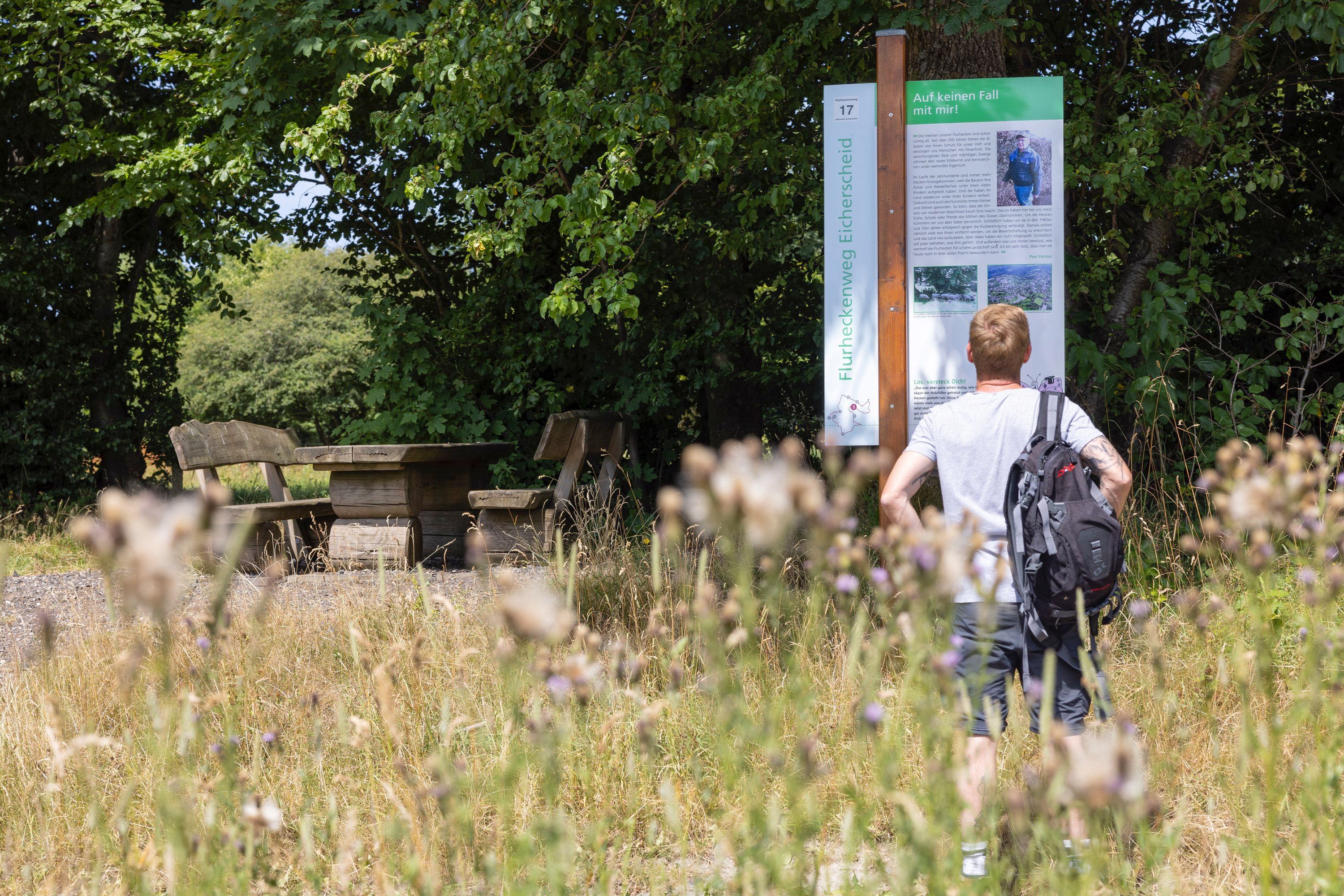 Start des 8 km langen Rundwegs ist die 1933 erbaute Pfarrkirche St. Lucia in Eicherscheid. Der Weg führt zunächst durch den Ortskern, vorbei an idyllischen Fachwerkhäusern, hohen Haushecken, kleinen Kapellen und Wegekreuzen. Verlässt man das Dorf, betritt man schließlich die beeindruckende Flurheckenlandschaft rund um den Ort. Die teils jahrhundertealten Rotbuchenhecken stellten einst eine Grenzmarkierung dar, dienen heute noch als lebendige Weidezäune und bieten Schutz vor rauen Eifelwinden. Der Schornsteinfeger-Schmetterling begleitet Kinder an sieben Informationstafeln, erzählt über die Geschichte der Eifeler Natur- und Heckenlandschaft und gibt den Kleinen jeweils eine Aufgabe zu lösen.