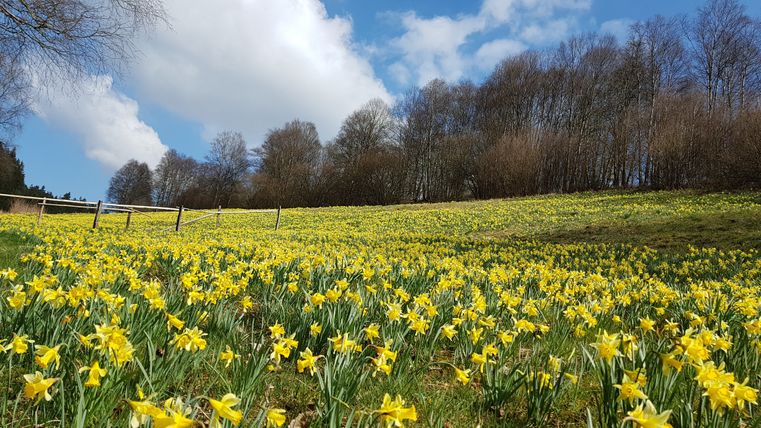 In der Umgebung der Schutzhütte gleich hinter dem Oberen Perlenbachsteg ist eine Erkundungspause angesagt. Von April bis Mai bietet die Natur hier ein besonderes Schauspiel. Ganz gleich, wohin das Auge blickt, überall leuchtet das Gelb der Narzissen in dieser blütenarmen Jahreszeit. Im gesamten Gebiet von Perlenbach und Fuhrtsbach wird die Anzahl der Pflanzen auf rund 10 Millionen geschätzt.