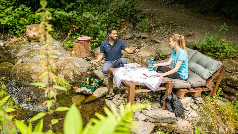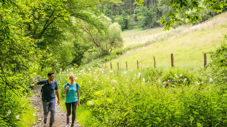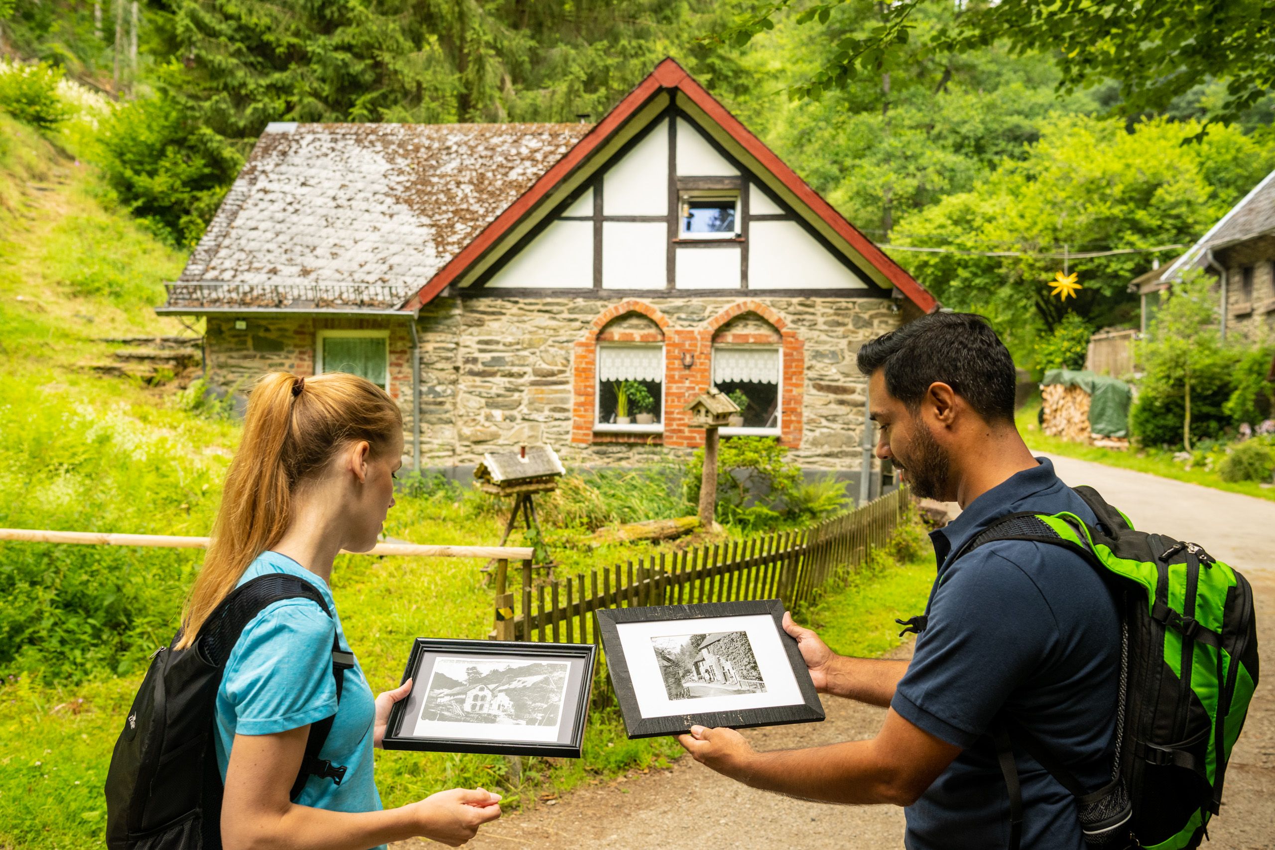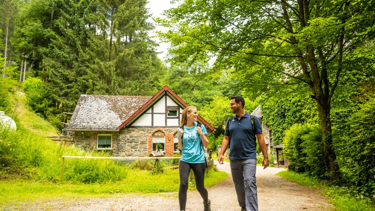 Die Eifeler Flurhecken und das reizvolle Tiefenbachtal. Durch den von Fachwerkhäusern geprägten Ortskern gelangt man entlang der ebenso für Eicherscheid typischen Flurhecken in das Tiefenbachtal. Der Weg schlängelt sich durch das idyllische Tal vorbei an der ehemaligen Ölmühle bis in das Rurtal. Von dort führt ein Anstieg zurück in den Ort.