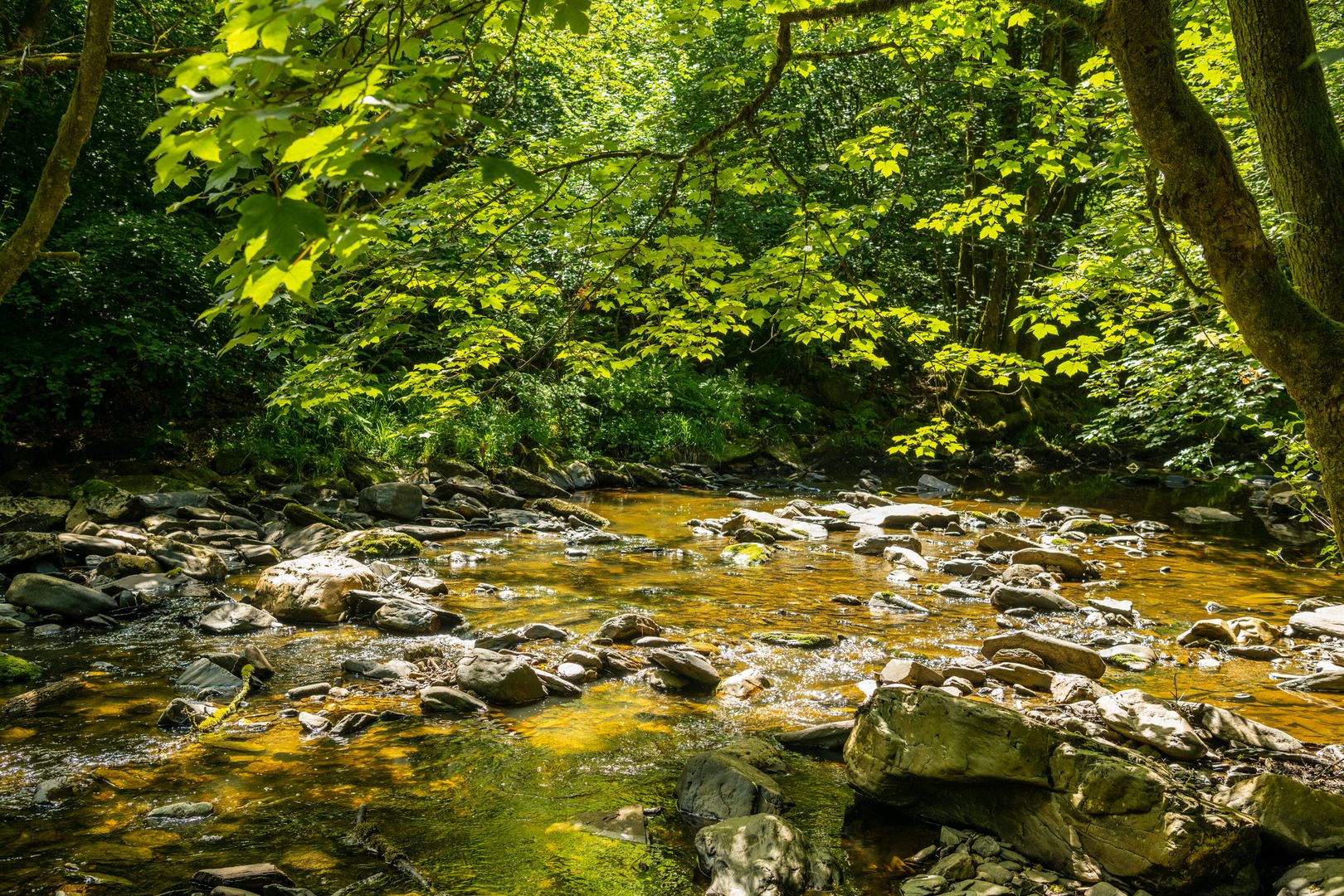 Natur pur und geschichtsträchtige Orte prägen den Wanderweg beiderseits der Rur. Vom Wanderparkplatz aus geht es zunächst zurück zu Straße. Auf der gegenüberliegenden Seite erinnern die Gebäude einer ehemaligen Reißwollfabrik an jene Zeit, als Monschau zu den Tuchmacherzentren Europas zählte. Das ehemalige Maschinenhaus beherbergt heute das Atelier eines Bildhauers.