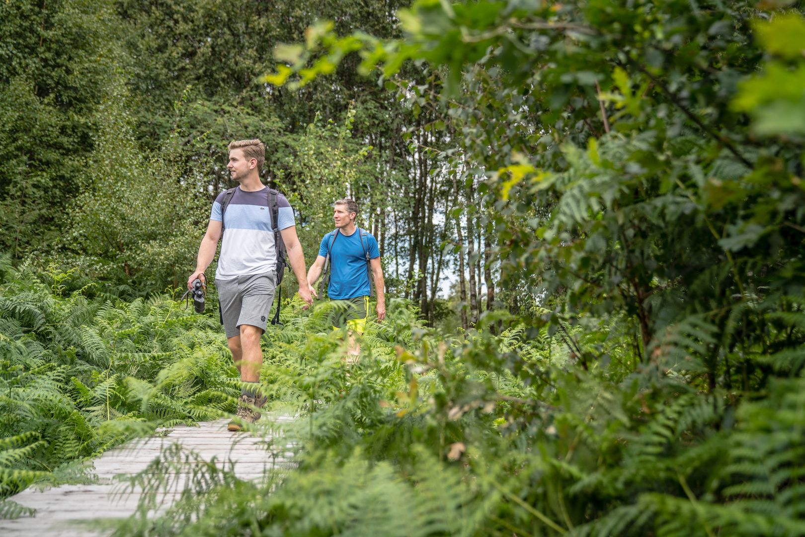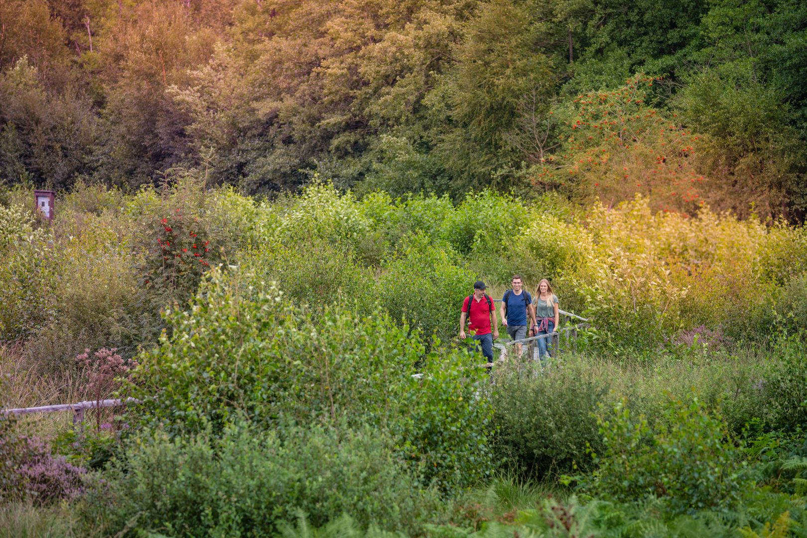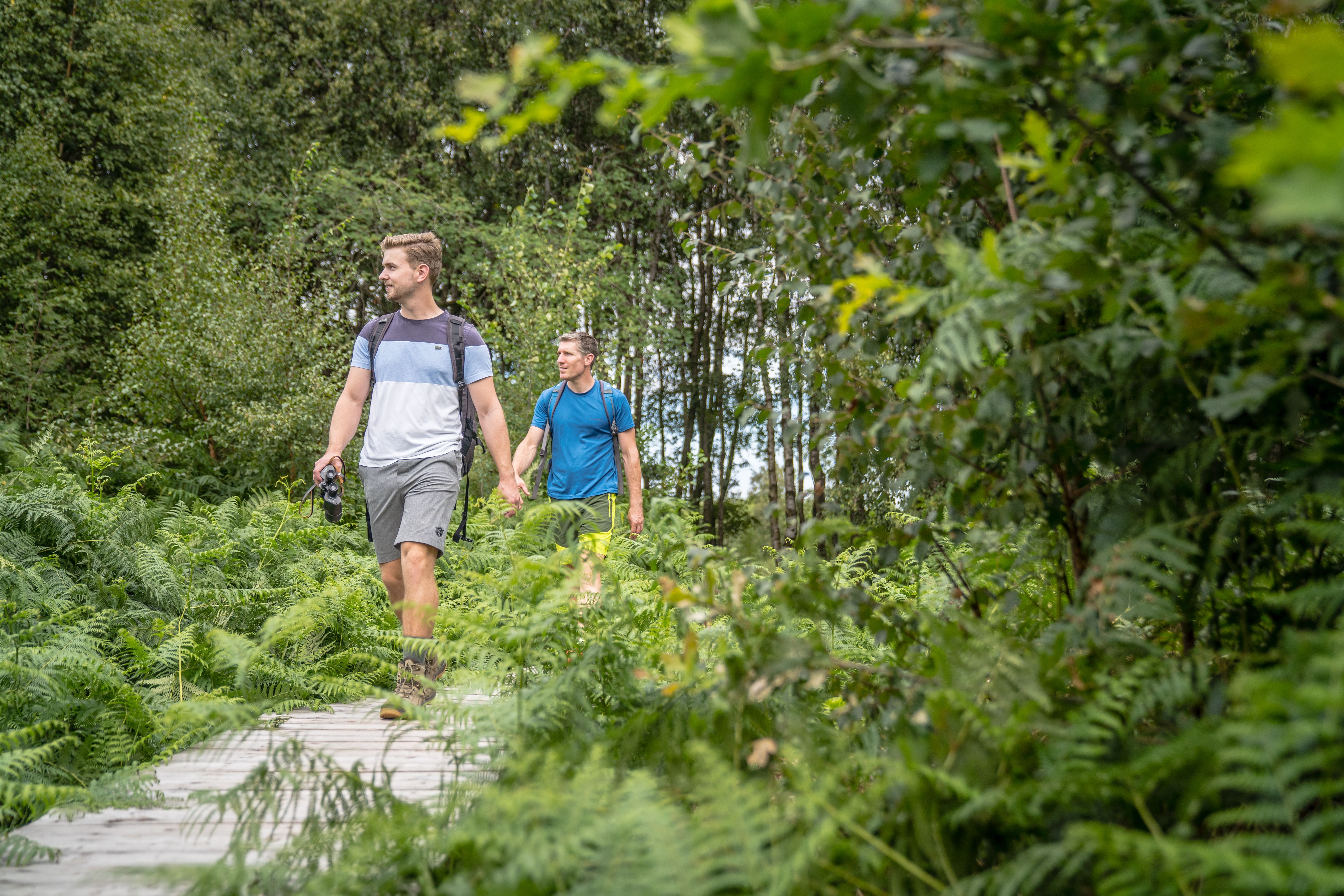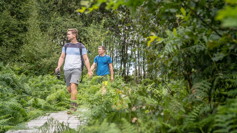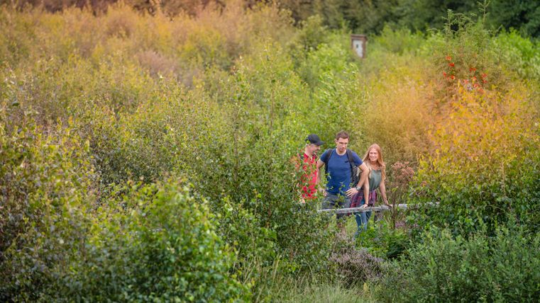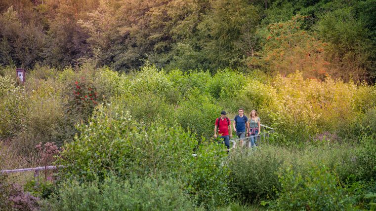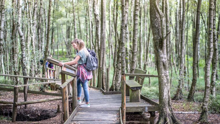 Der Lehrpfad führt euch über die ökologisch besonders wertvollen Moorgebiete des „Todtenbruchs“. Ihr könnt auf einem 700 Meter langen Bohlensteg direkt über die sensiblen Böden und durch den Quellbereich der Weißen Wehe wandern, ohne diese zu berühren. Die Moore umfassen ein ca. 40 Hektar großes Gebiet und sind mit ihren 3000 Jahren geologisch betrachtet noch relativ jung. Hochmoore sind hochsensible Biotope, die sich nur unter ganz speziellen Bedingungen bilden können. Dafür muss sich eine wasserundurchlässige Tonschicht im Boden befinden und die Niederschlagsmengen müssen ebenfalls ausreichend sein. Nur so kann das Torfmoos wachsen. Hier könnt ihr sehr seltene Pflanzenarten finden, wie beispielsweise den fleischfressenden Sonnentau, das flauschige weiße Wollgras, die rosa blühende Glockenheide oder verschiedene Orchideen.