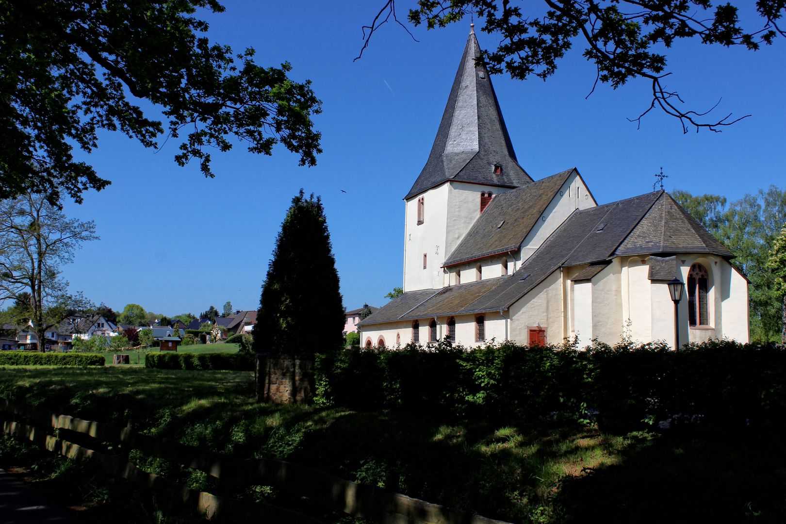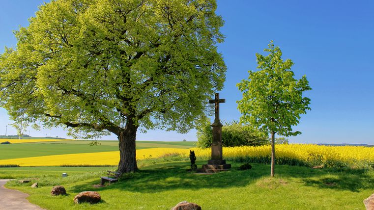 Der Vlattener Rundgang nimmt die „gute Stube“ des Ortes - die Jugendhalle - zum Ausgangspunkt. Gebaut wurde sie während des Ersten Weltkriegs, im Zweiten diente sie als Lazarett. Ihr großer Saal ist bis heute gefragter Treffpunkt im dörflichen Leben. Weiter führt Sie der Spaziergang zum südwestlichen Ortsrand, genauer in die Mühlengasse. Die pittoreske Straße erhielt ihren Namen von einer Wassermühle, die bis ins 19. Jhd. hier verortet war. Die Mühle zerkleinerte die in zwei nahegelegenen Bergwerken gewonnenen Kupfererze. Aus der Senke des Vlattener Baches steigt der Weg nun auf die Höhe des Lützenbergs. Dreimal täglich klingen die Glockenschläge der St. Michael Kapelle hinunter in den Ort. In der 1912 gebauten Kapelle finden sich sehenswerte Fensterbilder und spätmittelalterliche Malereien. Einen neuzeitlichen Kontrast dazu bildet die nächste Station: das knallbunte Mosaik der Schutzmantelmadonna. Das Marienbildnis wurde 1970 von Margarita Rieth aus 15 Zentnern Steinchen angefertigt. Ein paar Schritte weiter residiert fast ein wenig verwunschen die Burg Vlatten. Der markante, historisierende Burgturm aus dem 19. Jhd. ist nur eine der vielen baulichen Veränderungen und Ergänzungen, die die einstige Wasserburg seit dem 14. Jhd. erfahren hat. Ebenfalls am Vlattener Bach liegt die Basilika St. Dionysius. Mit ihrem mächtigen Westturm ist sie seit vielen Jahrhunderten das Wahrzeichen des Ortes. Die letzte Station lenkt Ihre Aufmerksamkeit auf die für das Rheinland so typischen Wegekreuze. Mit ein wenig Zeit können Sie noch zehn weitere in der Vlattener Gemarkung entdecken.
