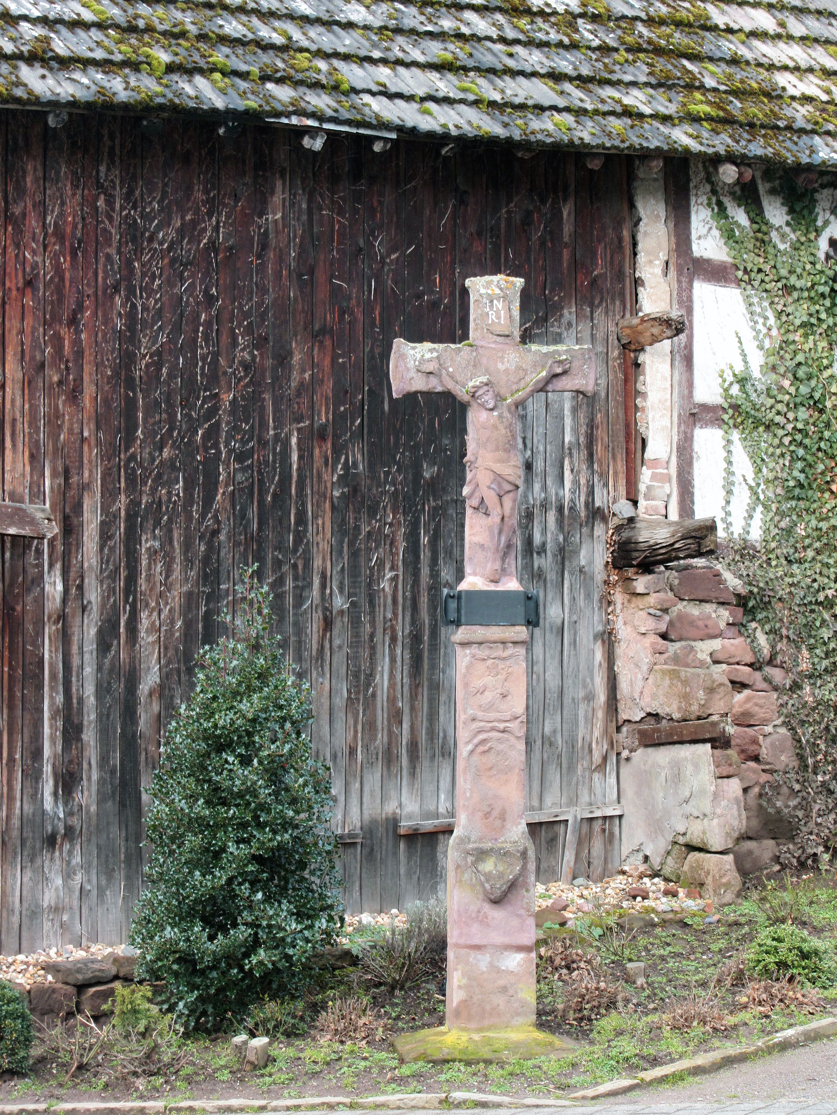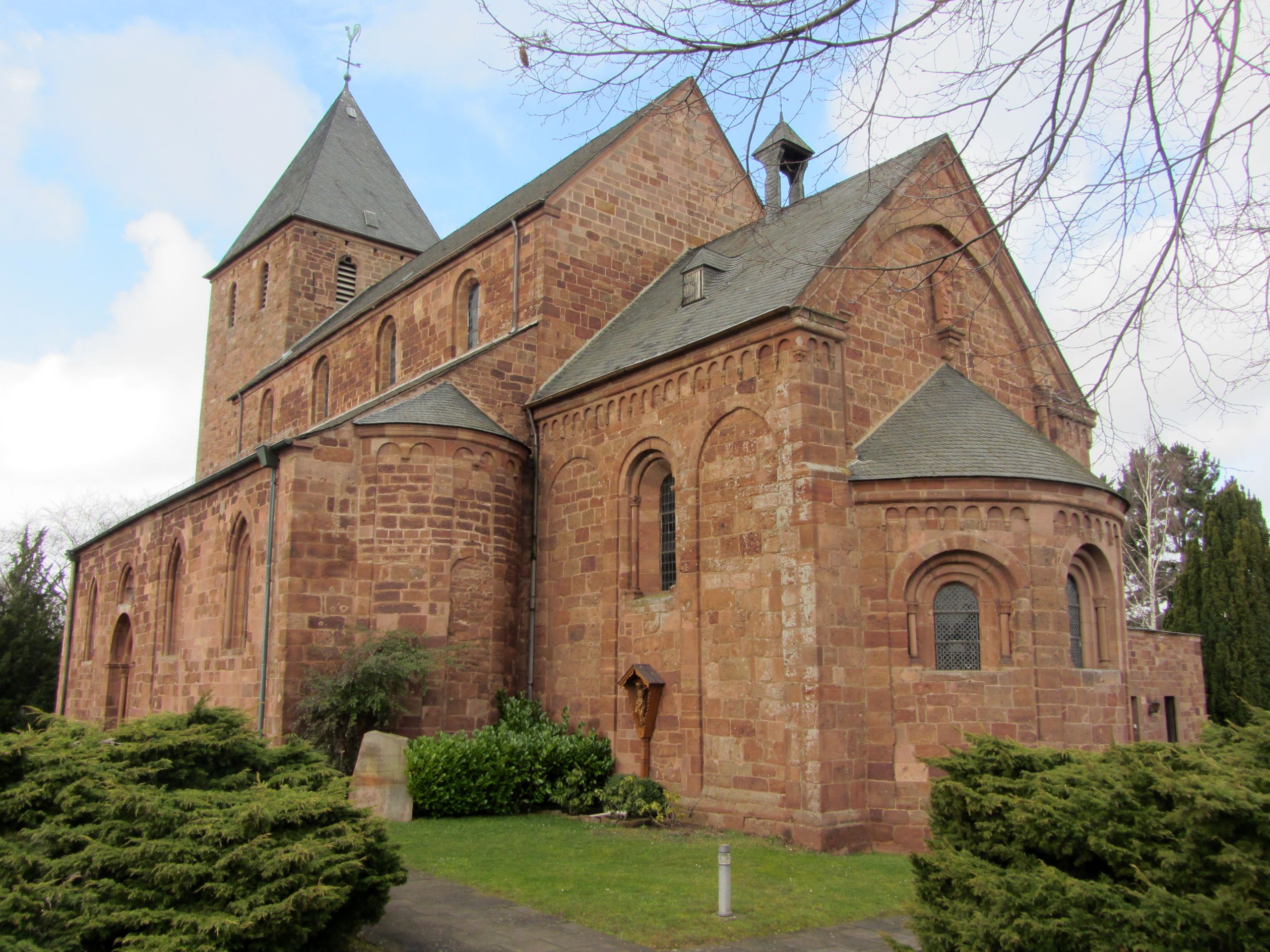 Vorbei an zahlreichen Einkehrmöglichkeiten erreichen Sie nach kurzer Zeit und einem weiteren kleinen Anstieg die Kirche Sankt Johannes Baptist, die Johannes dem Täufer geweiht ist. Danach führt die Strecke Sie zürück zum Marktplatz und von dort aus immer weiter bergab nach Brück, wo Sie die Rur überqueren, bevor es wieder stetig bergauf geht. Schmidt ist Ihr nächstes Ziel. Dazu folgen Sie dem kleinen Schliebach bis hinein ins reizvolle Schliebachtal und dann hinauf nach Schmidt, wo Sie im Dorfzentrum die St. Hubertus Kirche finden. Von den Schmidter Höhen geht es nun wieder bergab Sandsteinkreuz bei Abenden. in Richtung Rursee und dann weiter zur Rurtalsperre in Schwammenauel.