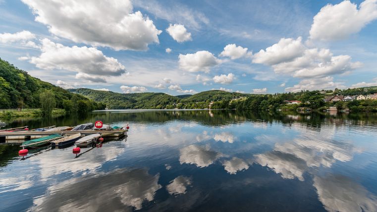 Mountainbike-Tour durch die Rureifel rund um Obermaubach: Wenn man an den Parkplätzen der Bahnhöfe in Ober- oder Untermaubach startet, gelangt man schnell zum Staubecken Obermaubach (ebenfalls ein Parkplatz), wo sich ein wunderschöner Blick auf den Stausee eröffnet. Diese verkehrsarme MTB-Runde ist fahrtechnisch leicht zu bewältigen, erfordert jedoch eine gute konditionelle Leistung des Radfahrers.