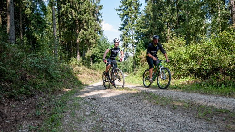 Mountainbike-Tour rund um Obermaubach in der Eifel: Mit relativ hohen, konditionellen Ansprüchen bewältigt man die welligen, wenig befestigten Wald- und Panoramawege rund um das Staubecken von Obermaubach.