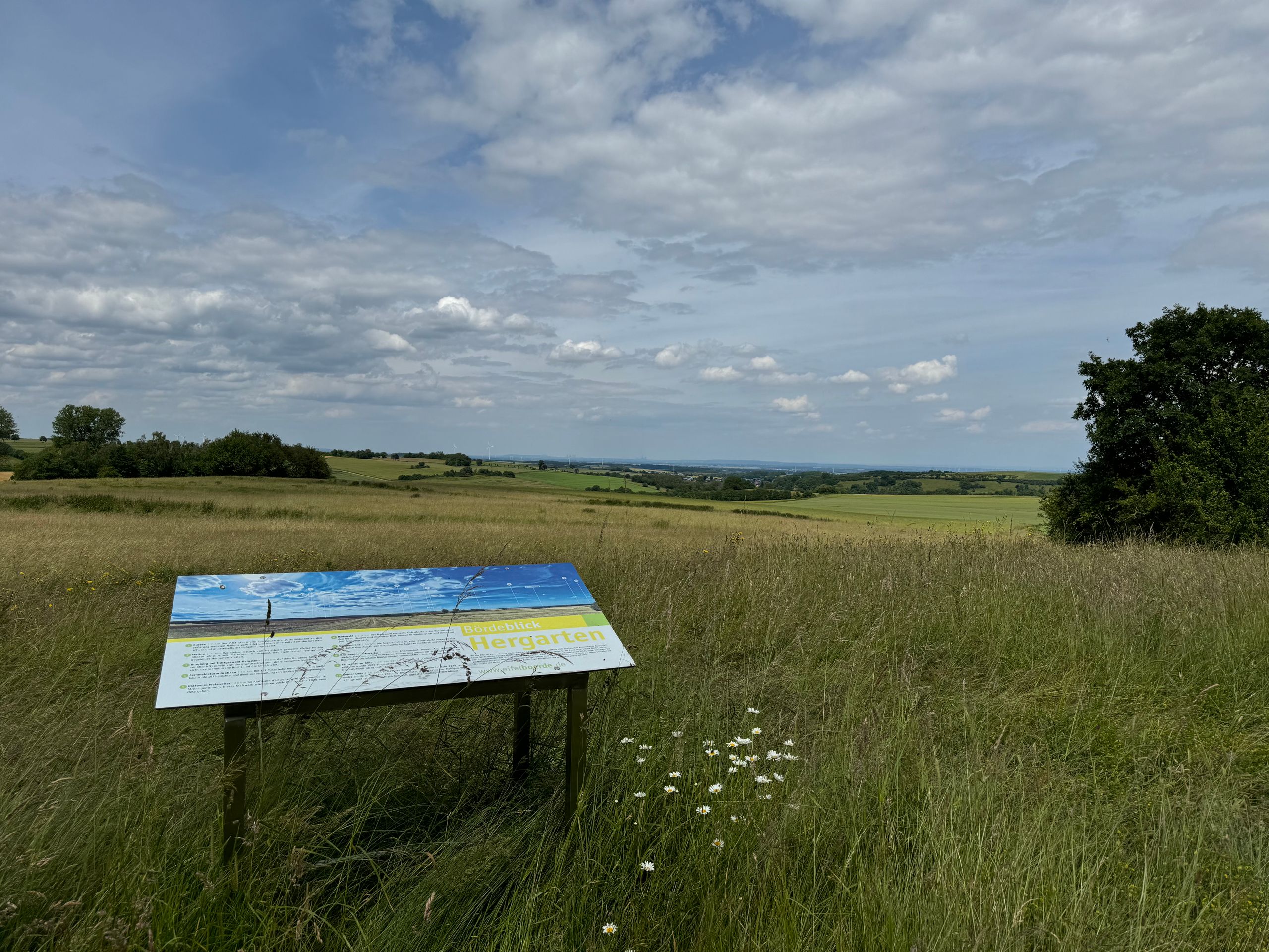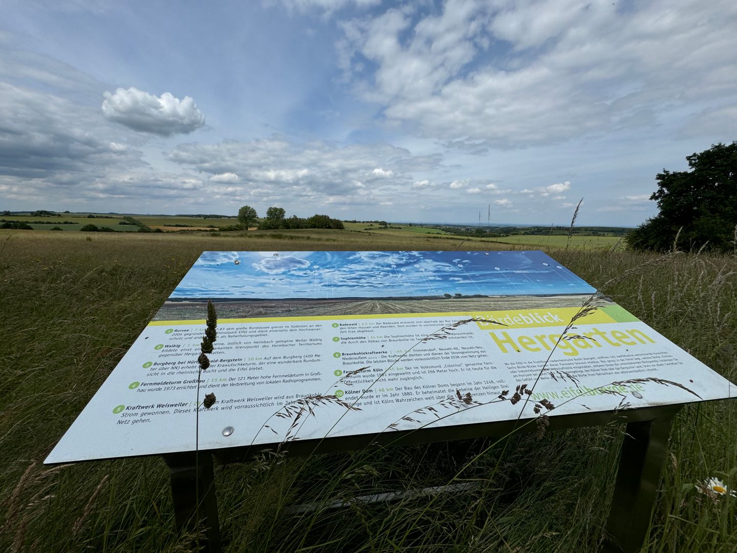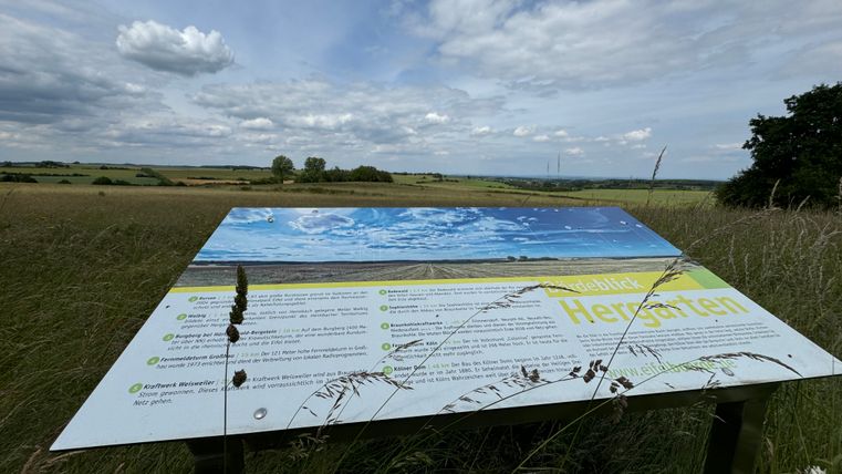 Hergarten, das schöne Dorf zwischen Eifel und Börde ist der Ausgangspunkt für eine kurze Wanderung mit vielen Fernblicken. Die gut 4 km lange Runde startet am Wanderparkplatz „ Zum Hohen Schirm“ südwestlich des Dorfausganges Richtung Düttling. Zunächst geht es leicht bergauf und am Waldrand entlang. Zur Rechten eröffnet sich schon der Blick ins Rheintal. Nach der Querung der Kreisstraße gelangen Sie zum Bördeblick Nievesknipp.