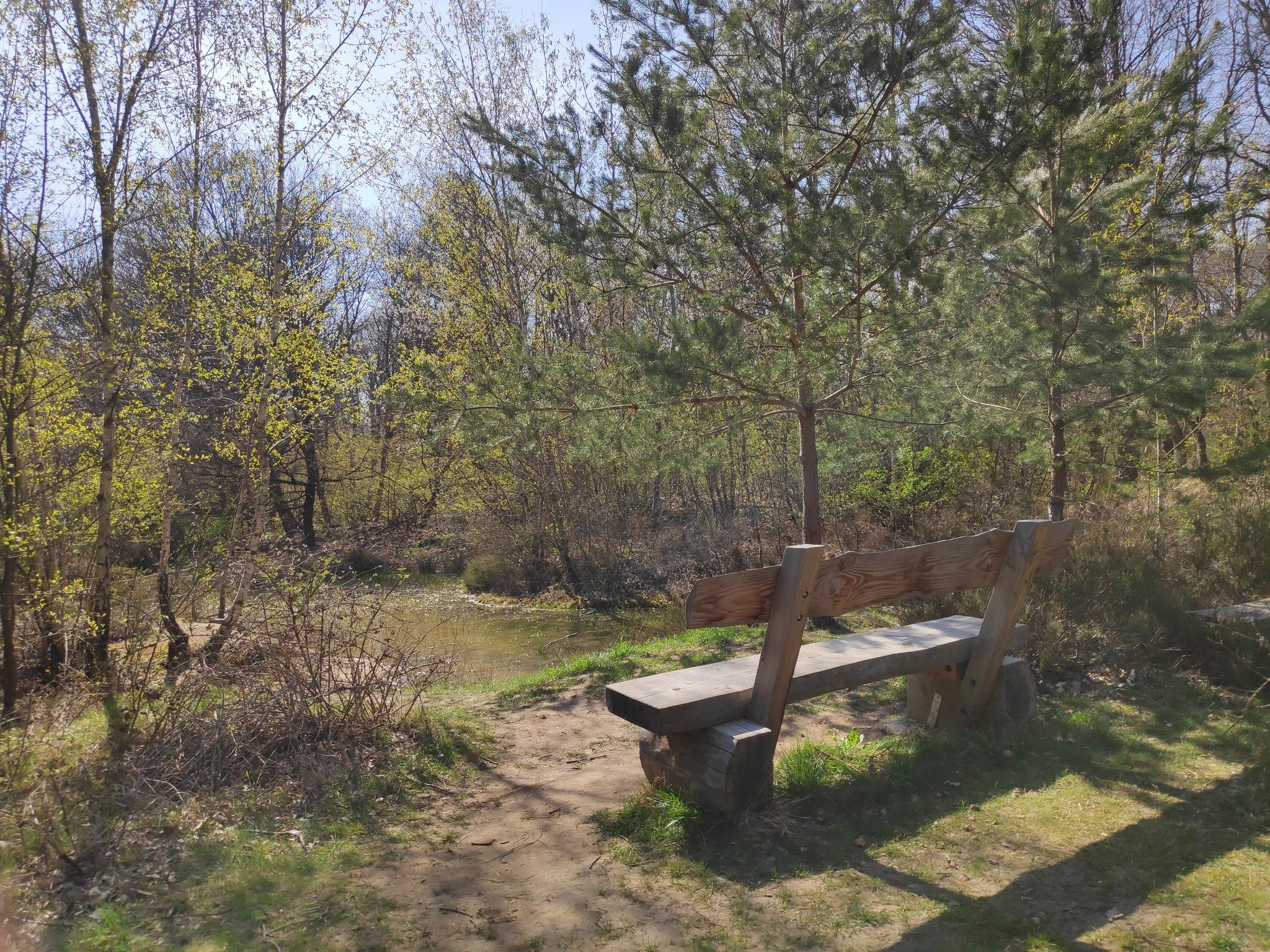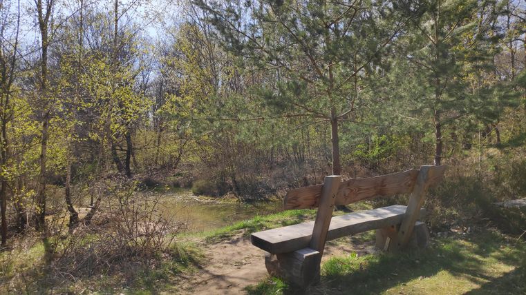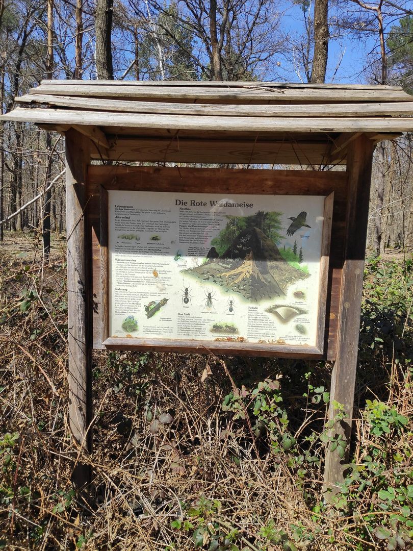 An der Infotafel über die Rote Waldameise trennt sich der große Heideweg (dunkelblaue Markierung) vom Rundweg Nr. 52. Wir folgen ab dieser Stelle der Eifelvereins-Markierung Nr. 52 geradeaus. Am Ende des Weges biegen wir an der T-Kreuzug mit Ruhebank rechts ab und treffen hier wieder auf die dunkelblaue Markierung des großen Heideweges. Dieser begleitet uns und den Wanderweg Nr. 52 bis zum Ende der Tour. Unterwegs lädt ein sogenannter "offener Waldpilz" zum Rasten und Ruhen ein.