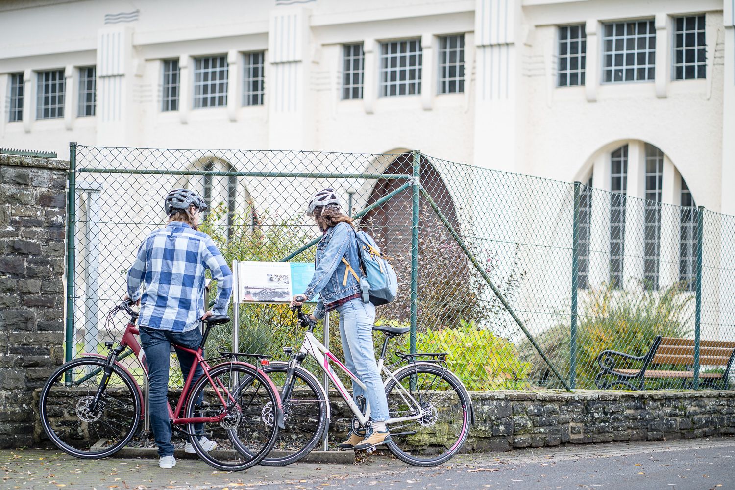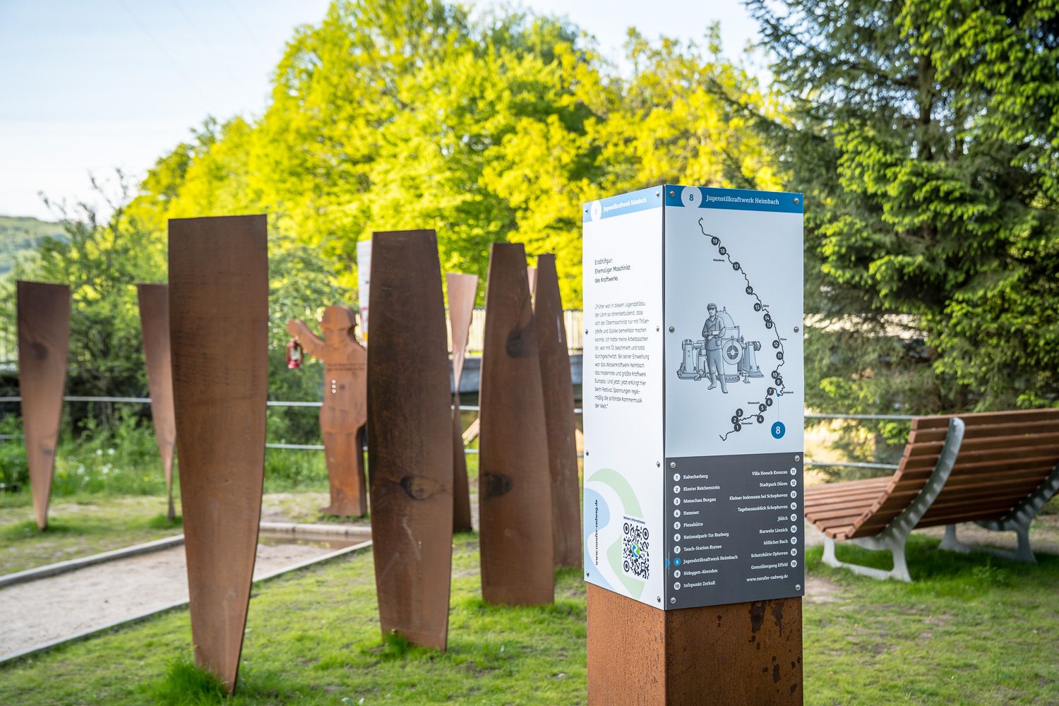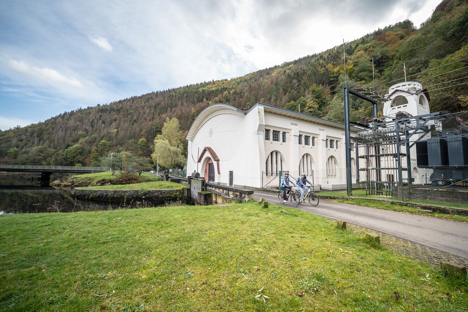 Nach etwa zwei Drittel der Strecke erreicht man das Jugendstikraftwerk Heimbach. Es wurde 1905 in Betrieb genommen und bezieht sein Wasser aus der Urfttalsperre über den Kermeterstollen, der 110 m oberhalb des Kraftwerkes in zwei Druckrohre übergeht. Das Elektrizitätswerk ist bis heute in Betrieb. Die ursprüngliche Ausrüstung mit acht Turbinen wurde 1975 durch zwei neue Maschinen mit höherem Wirkungsgrad ersetzt. Seitdem hat die Anlage eine installierte Leistung von 16.000 Kilowatt zur Abdeckung von Spitzenlast. Von den alten Maschinen sind noch einige an Ort und Stelle verblieben, da die neuen Stromerzeuger deutlich weniger Platz beanspruchen.