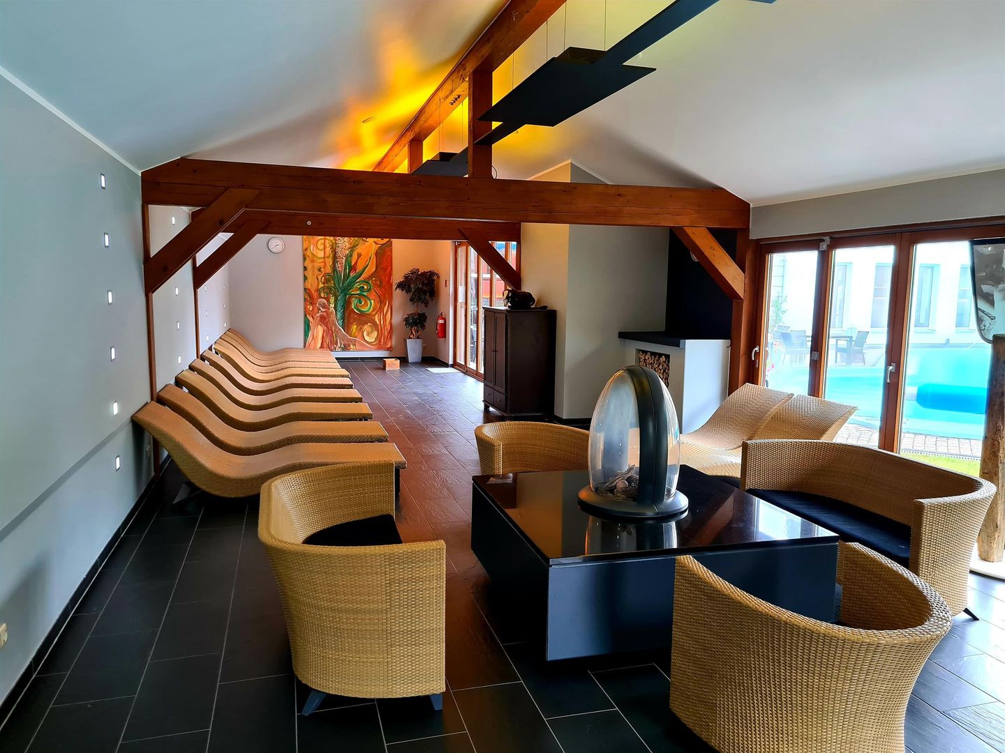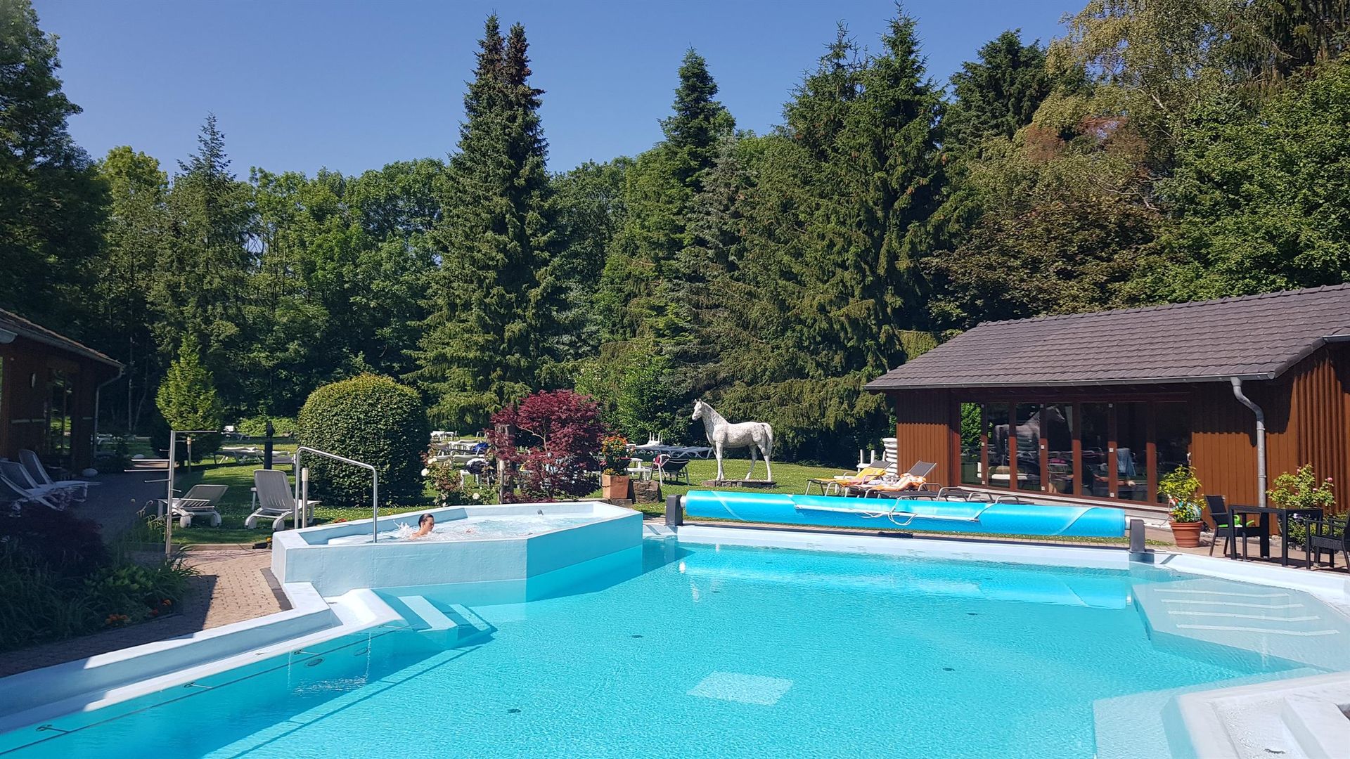 Vom Hotel aus ist die Wellnessoase „Roetgen Therme“ mit 7 Saunen (darunter die Eifeler Schwitzhütte, die Himalaya Kirstallsalz Sauna, das Aromabad und das Blütenbad u.a.) und 5 Pools direkt zugänglich. Highlight ist der große Open-AirMeerwasserpool (ganzjährig beheizt) im 5000 m² großen Thermenpark.