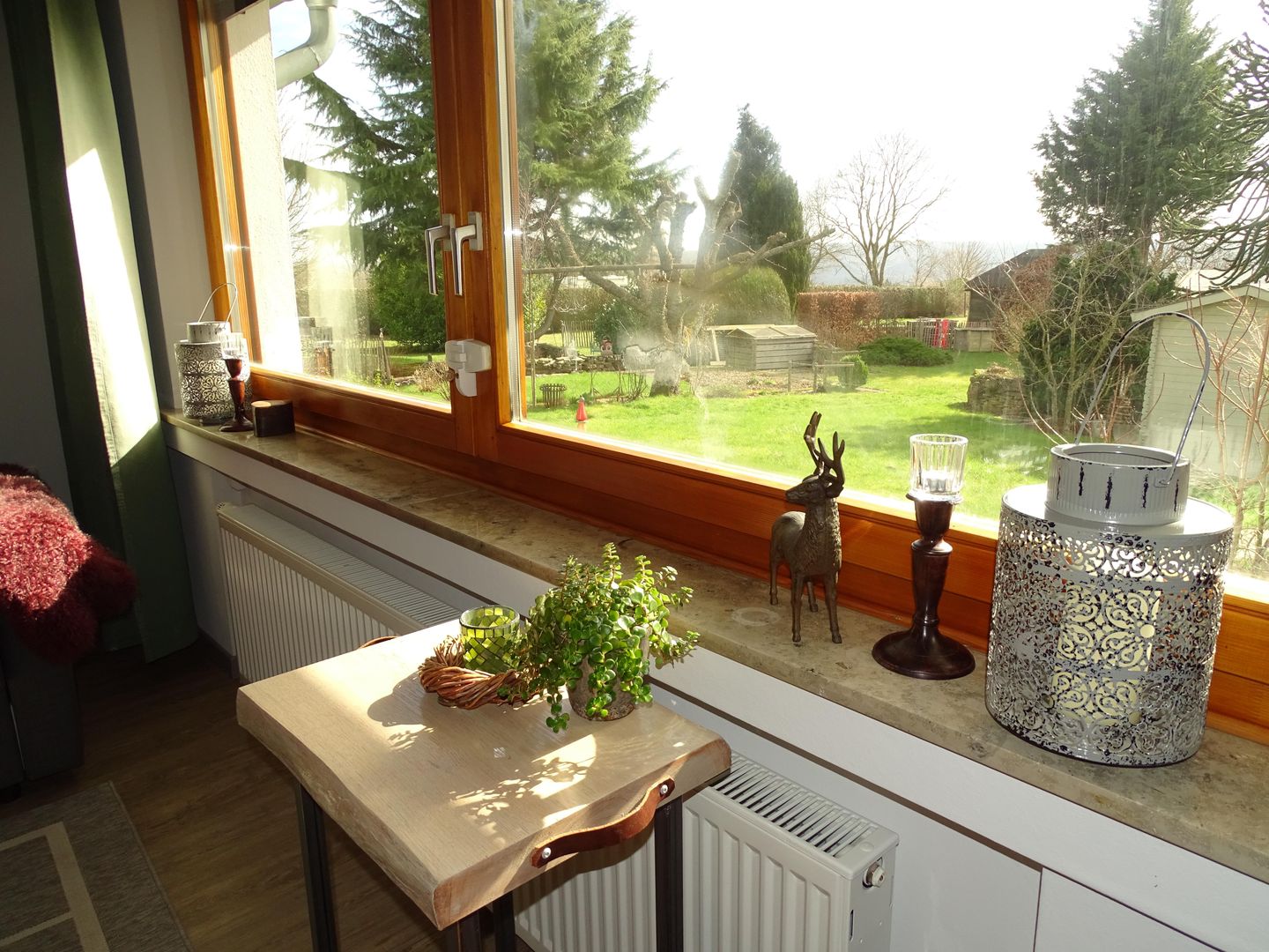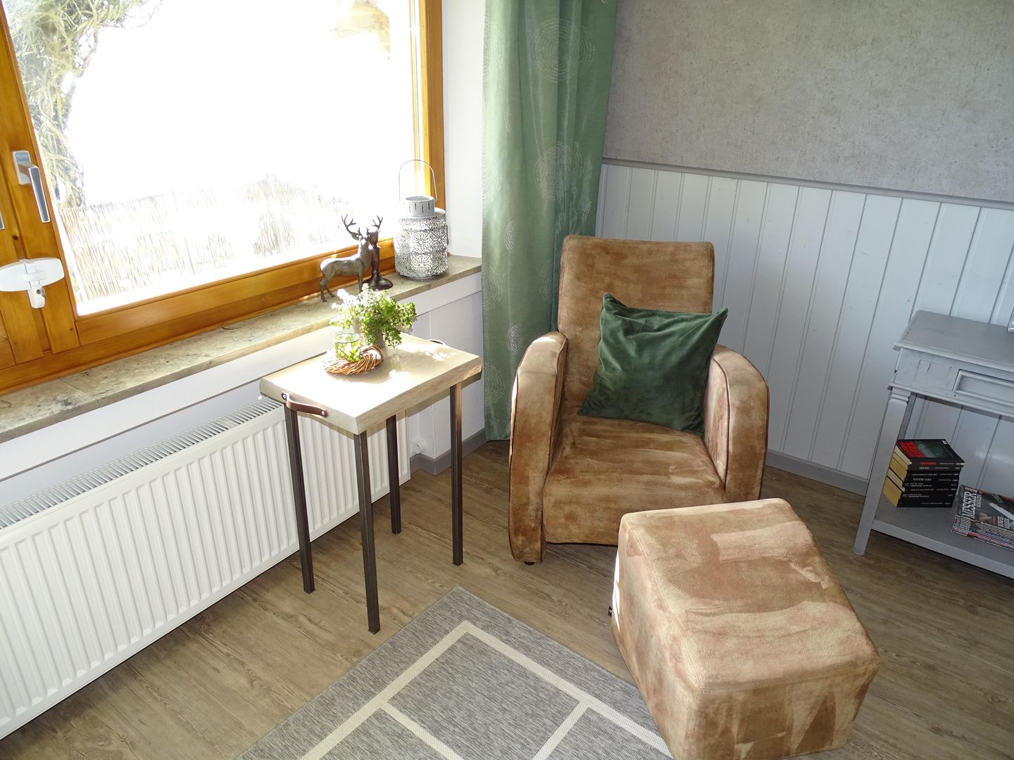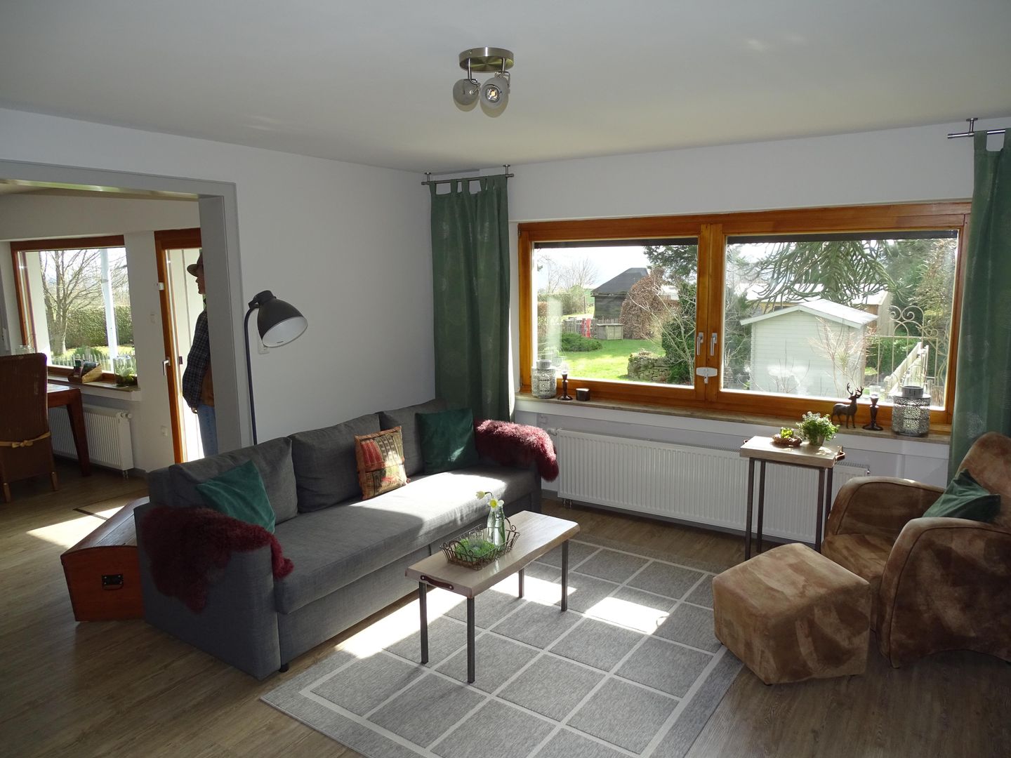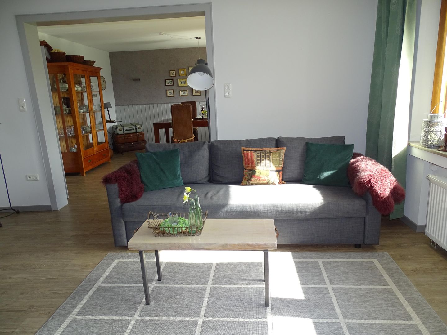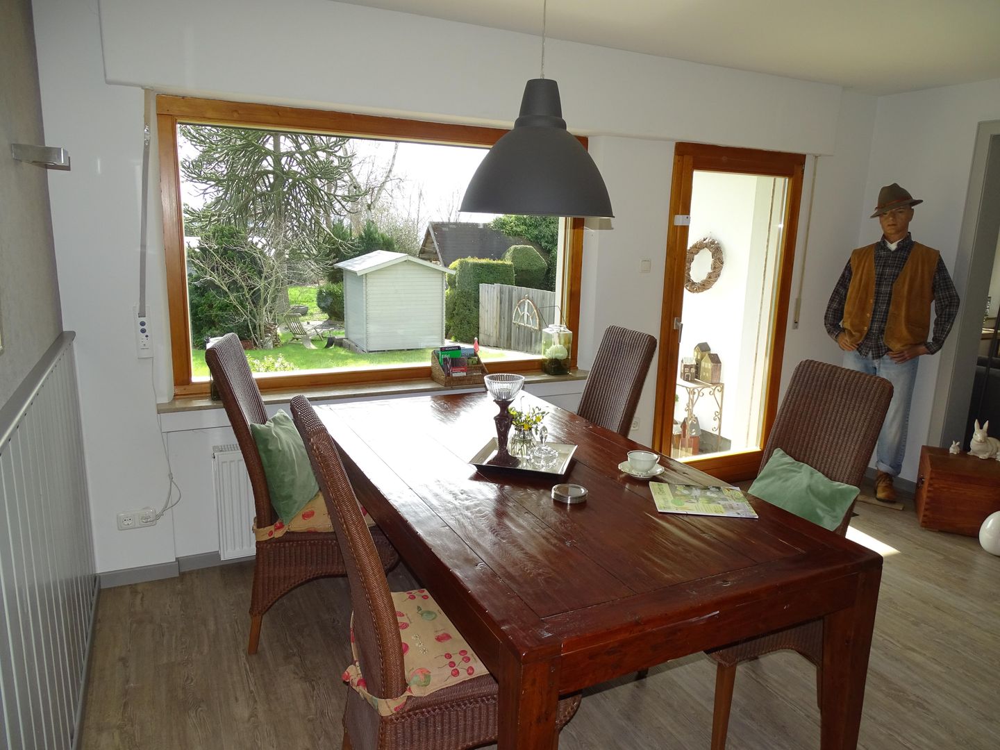 Wohn- und Esszimmer sind gemütlich und grosszügig eingerichtet und liegen zur Südseite mit Blick in einen grossen Garten. Zusätzlich steht im Wohnzimmer eine grosse Schlafcouch zur Verfügung.