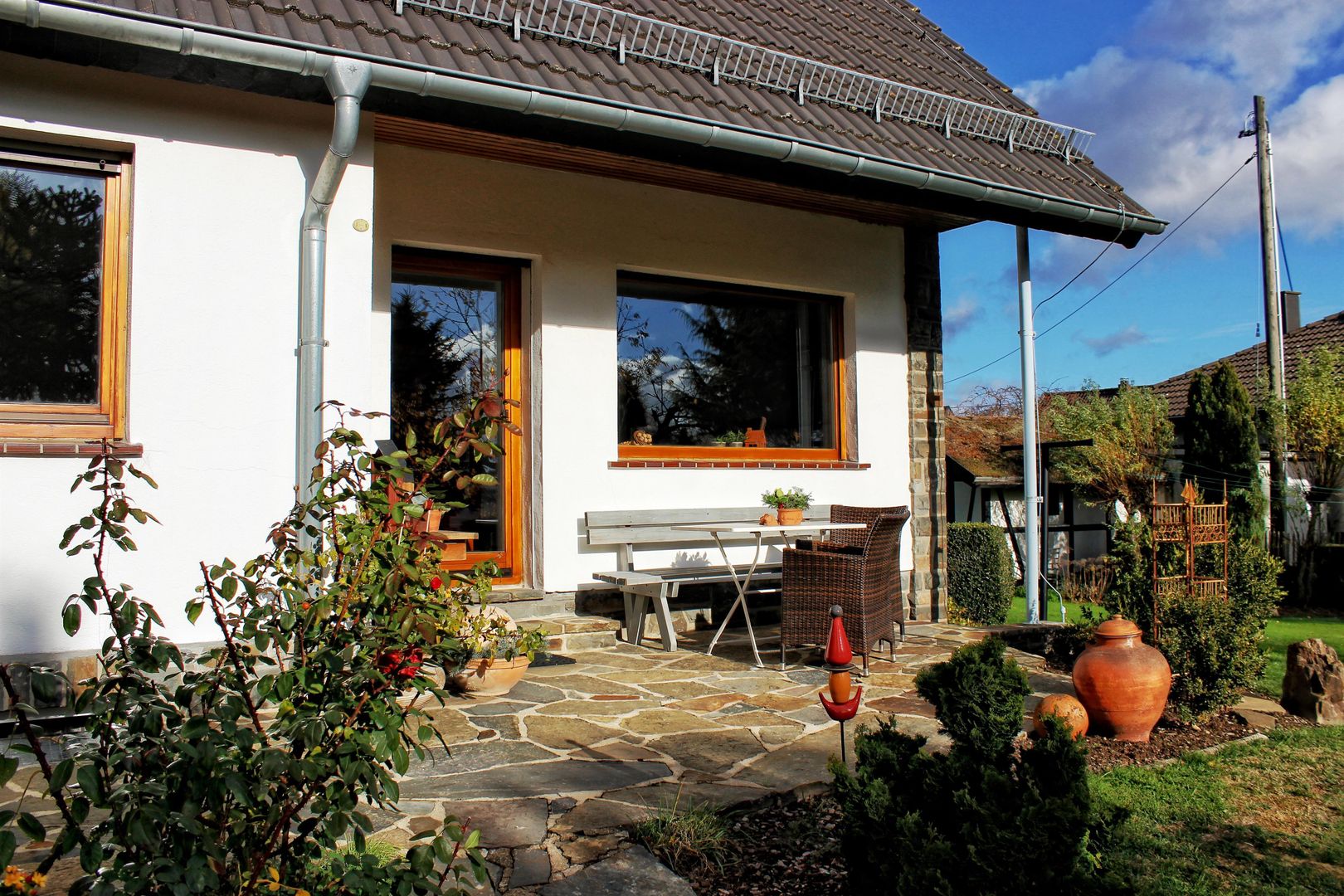 Direkt am Wohnzimmer schließt sich eine überdachte und möblierte Terasse an.