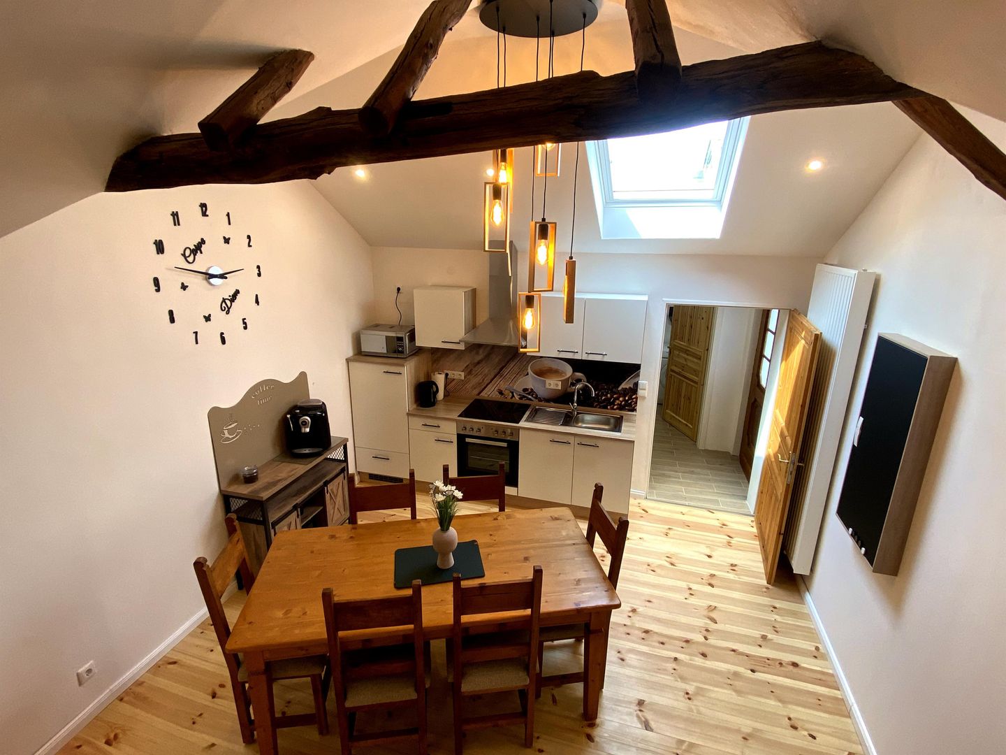 Liebevoll sanierte Ferienwohnung im historischen Fachwerkhaus. Hier trifft Geschichte auf Moderne. Sie erwartet eine große Dusche, Doppel-Schlafzimmer, Schlafbalkon, Wohnbereich mit Schlafcouch und Küchenzeile nebst Sideboard mit Kaffeevollautomat