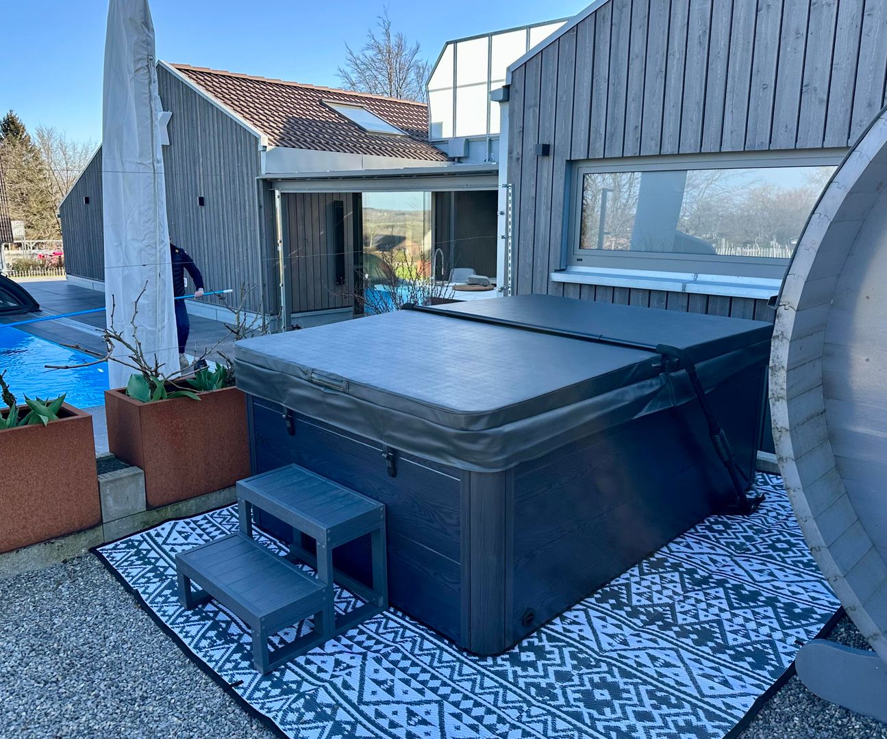 Sauna und Whirlpool im Außenbereich zur Gemeinschaftsnutzung. (Whirpool = Mai bis Oktober nutzbar)