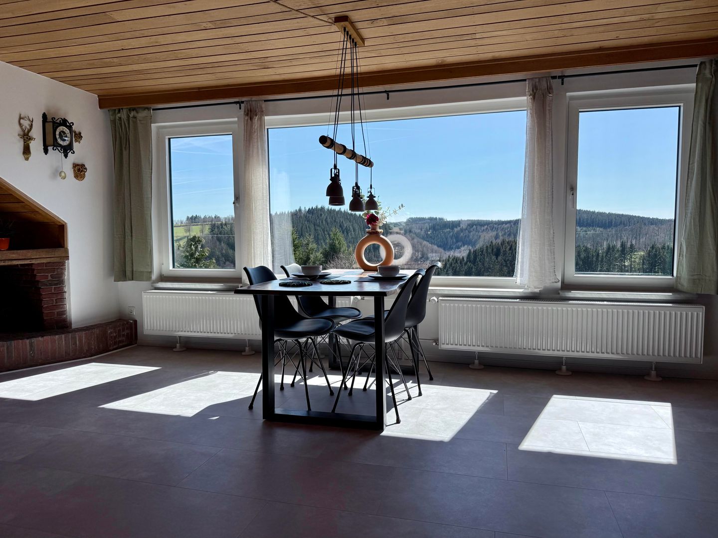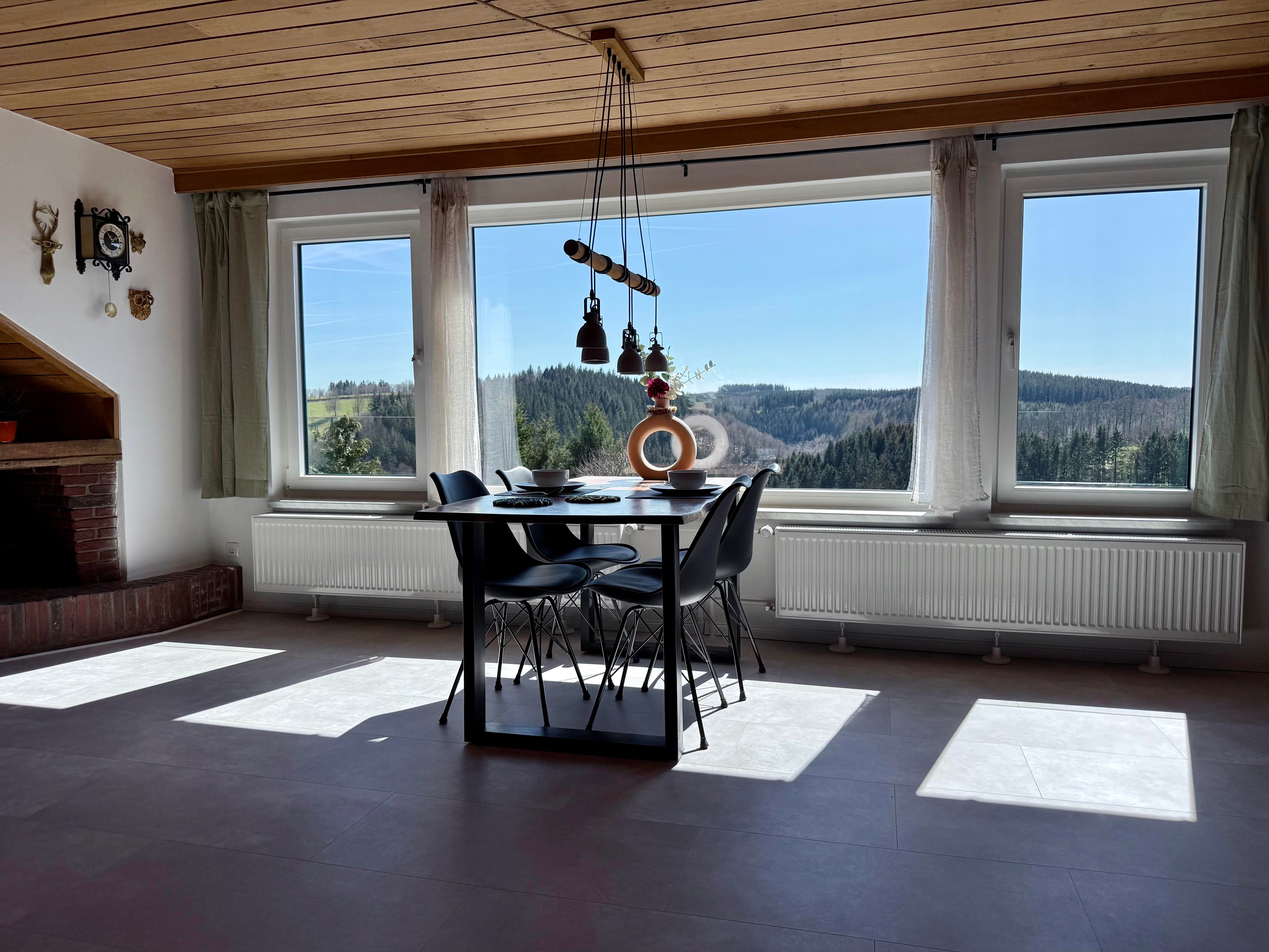 Das geräumige Wohn-/Esszimmer ist mit einem Flachbild-TV ausgestattet und der Deko-Kaminofen im Wohnzimmerbereich sorgt für eine gemütliche Atmosphäre. Vom Essbereich aus genießen Sie einen herrlichen Blick über das Tal von Monschau.
