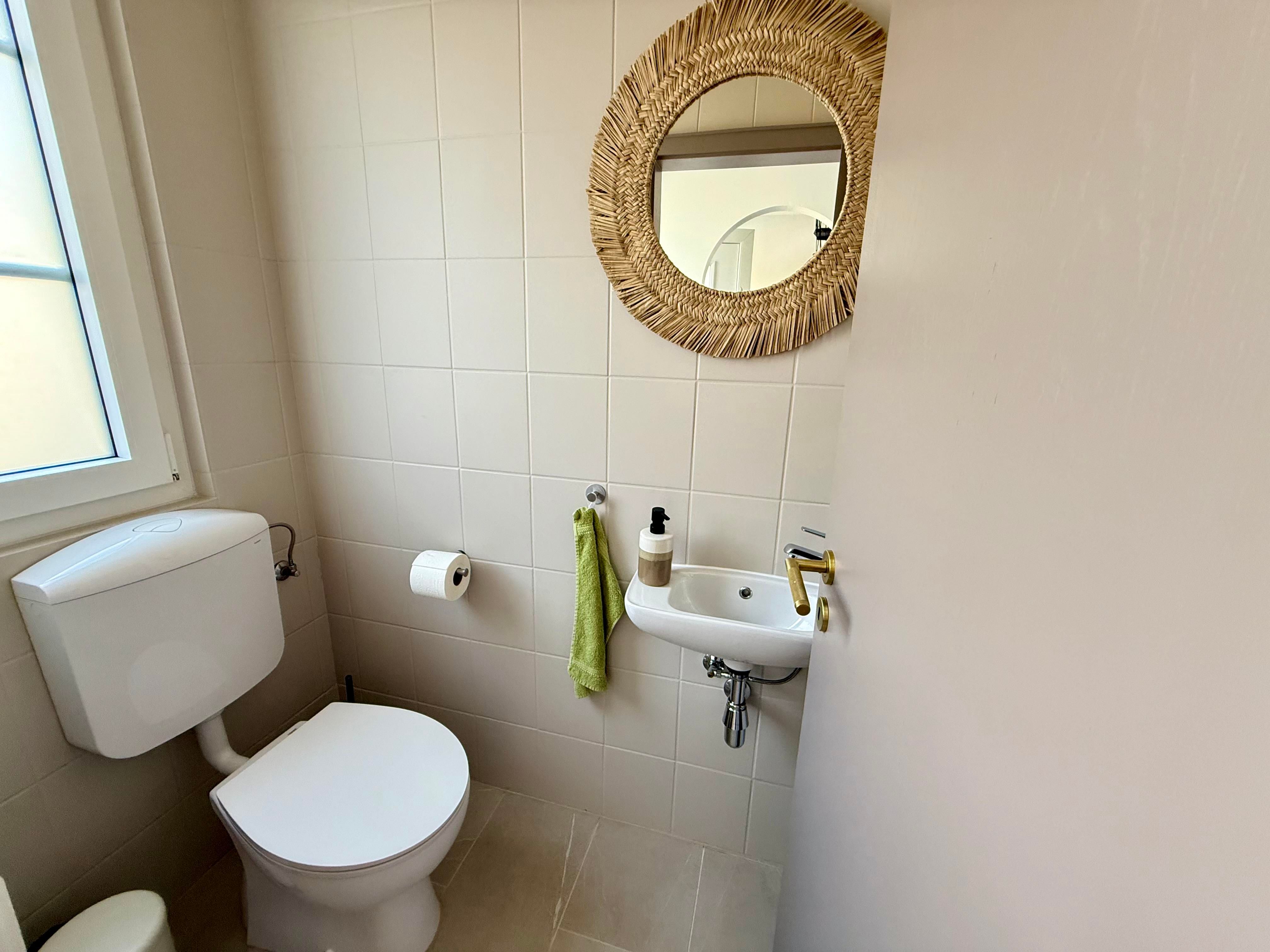 Das moderne Badezimmer verfügt über eine Dusche, ein WC und ein Waschbecken.