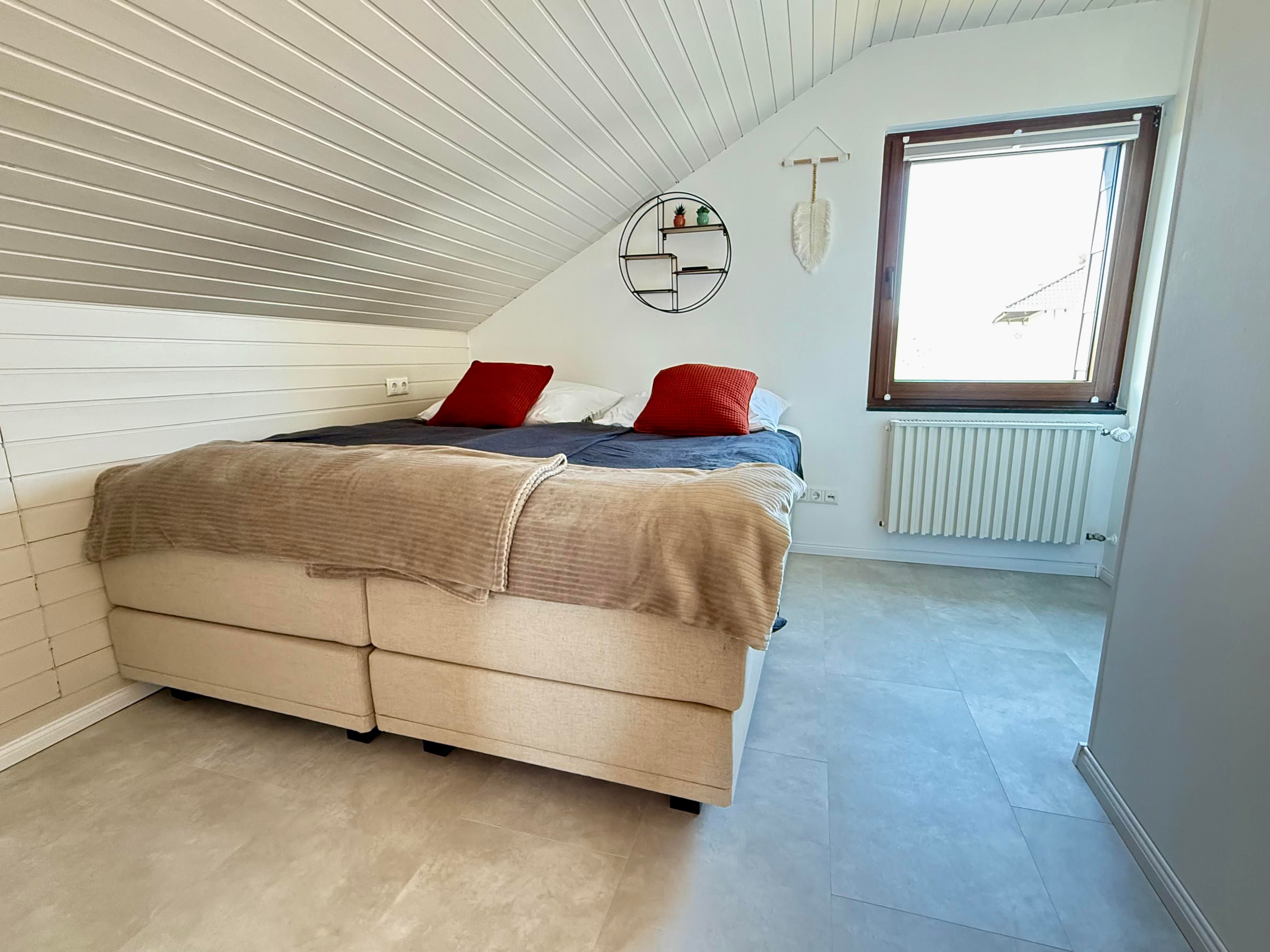 Das gemütliche Schlafzimmer unter der Dachschräge beherbergt ein komfortables Doppelbett (180x200cm) mit hochwertigen Matratzen.