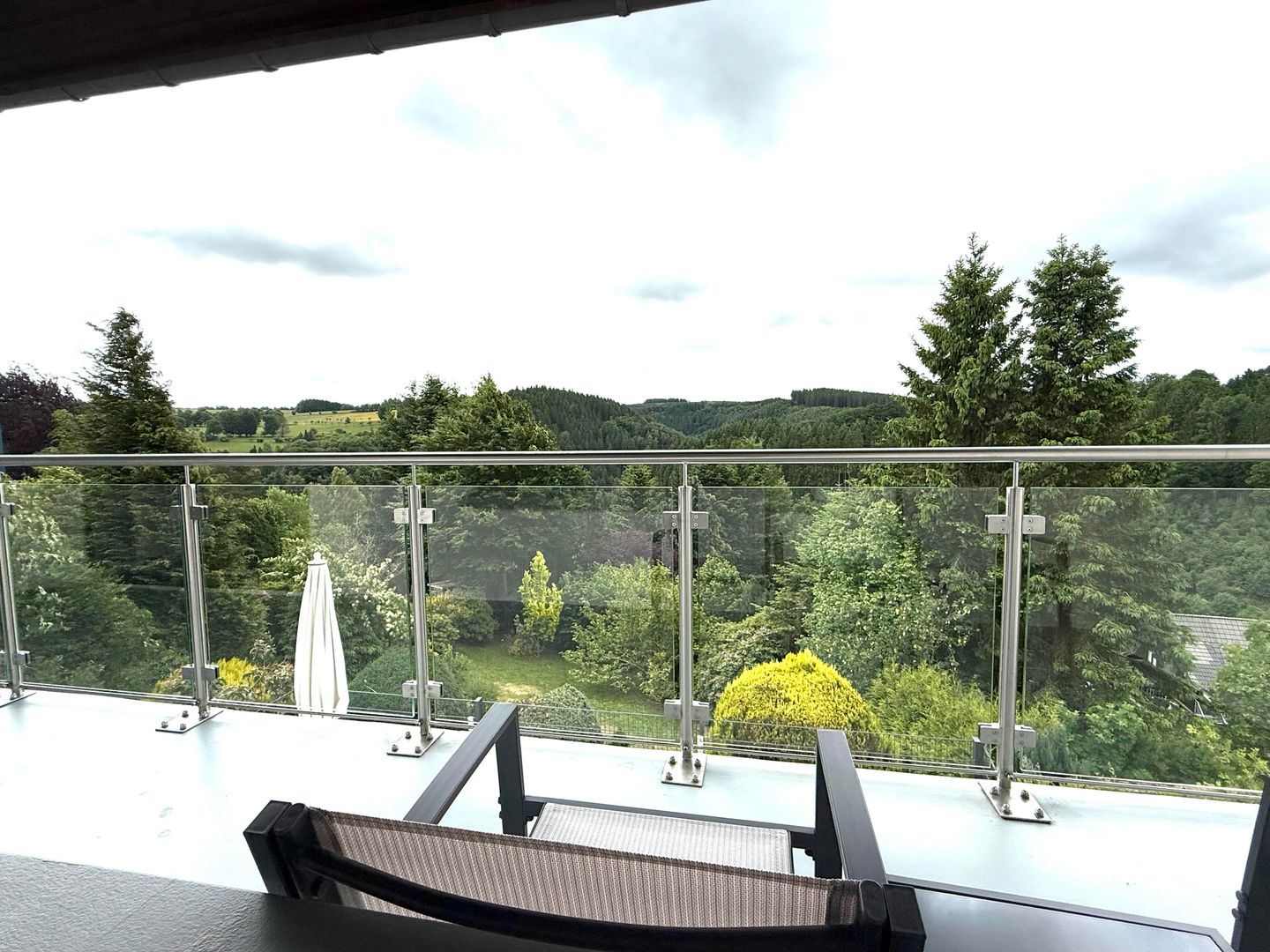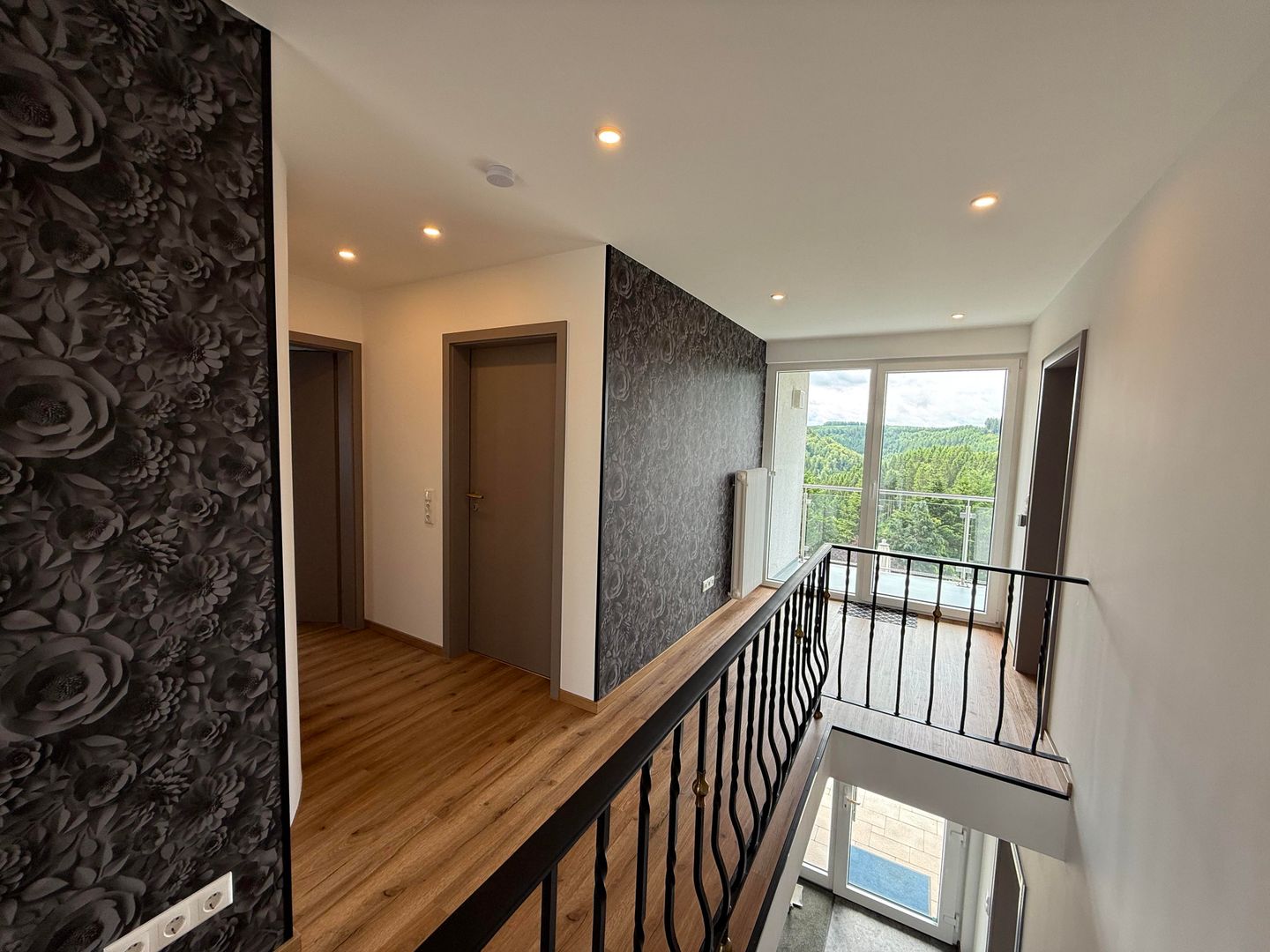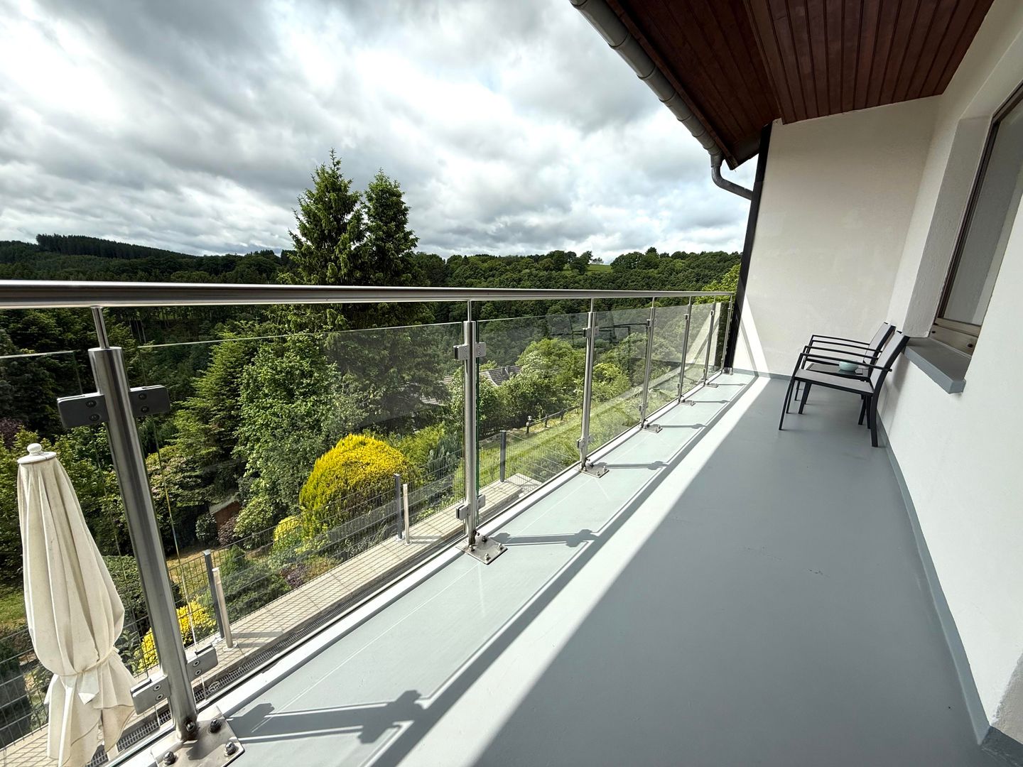Vom oberen Flur aus gelangen Sie auf den großzügigen Balkon, der mit einem kleinen Tisch und zwei Sitzgelegenheiten ausgestattet ist. Hier können Sie die frische Luft und den Ausblick genießen.