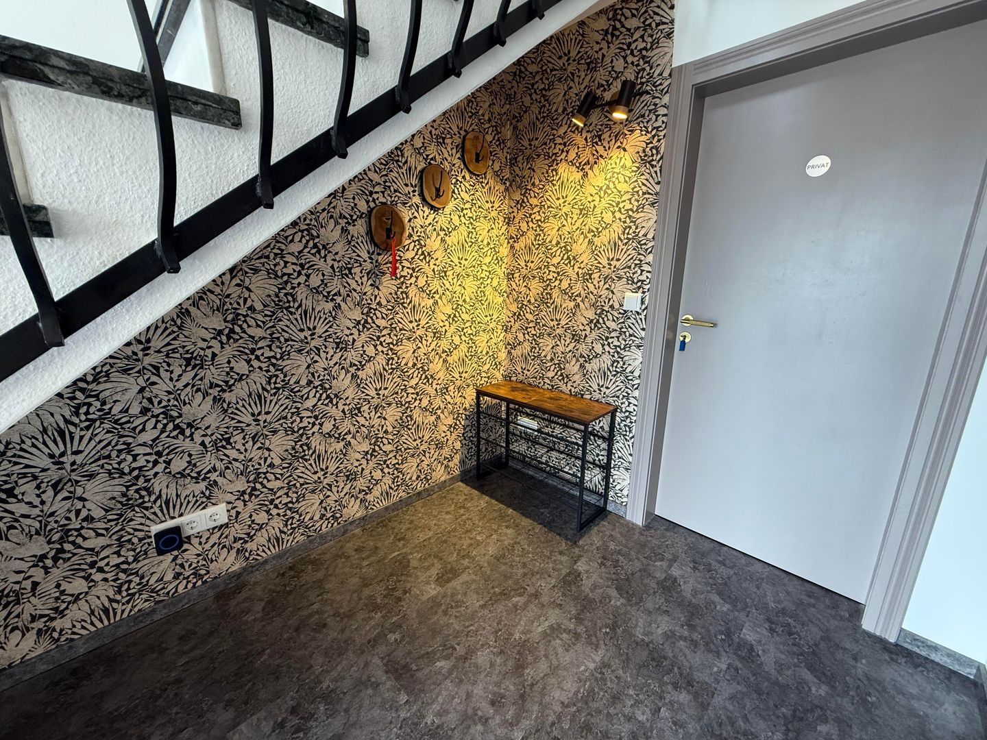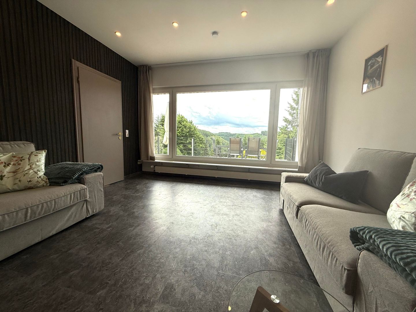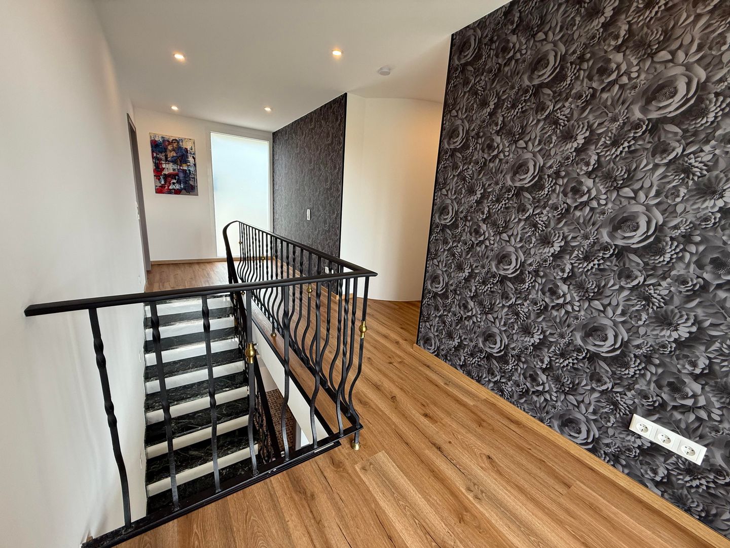 Vom oberen Flur aus gelangen Sie auf den großzügigen Balkon, der mit einem kleinen Tisch und zwei Sitzgelegenheiten ausgestattet ist. Hier können Sie die frische Luft und den Ausblick genießen.