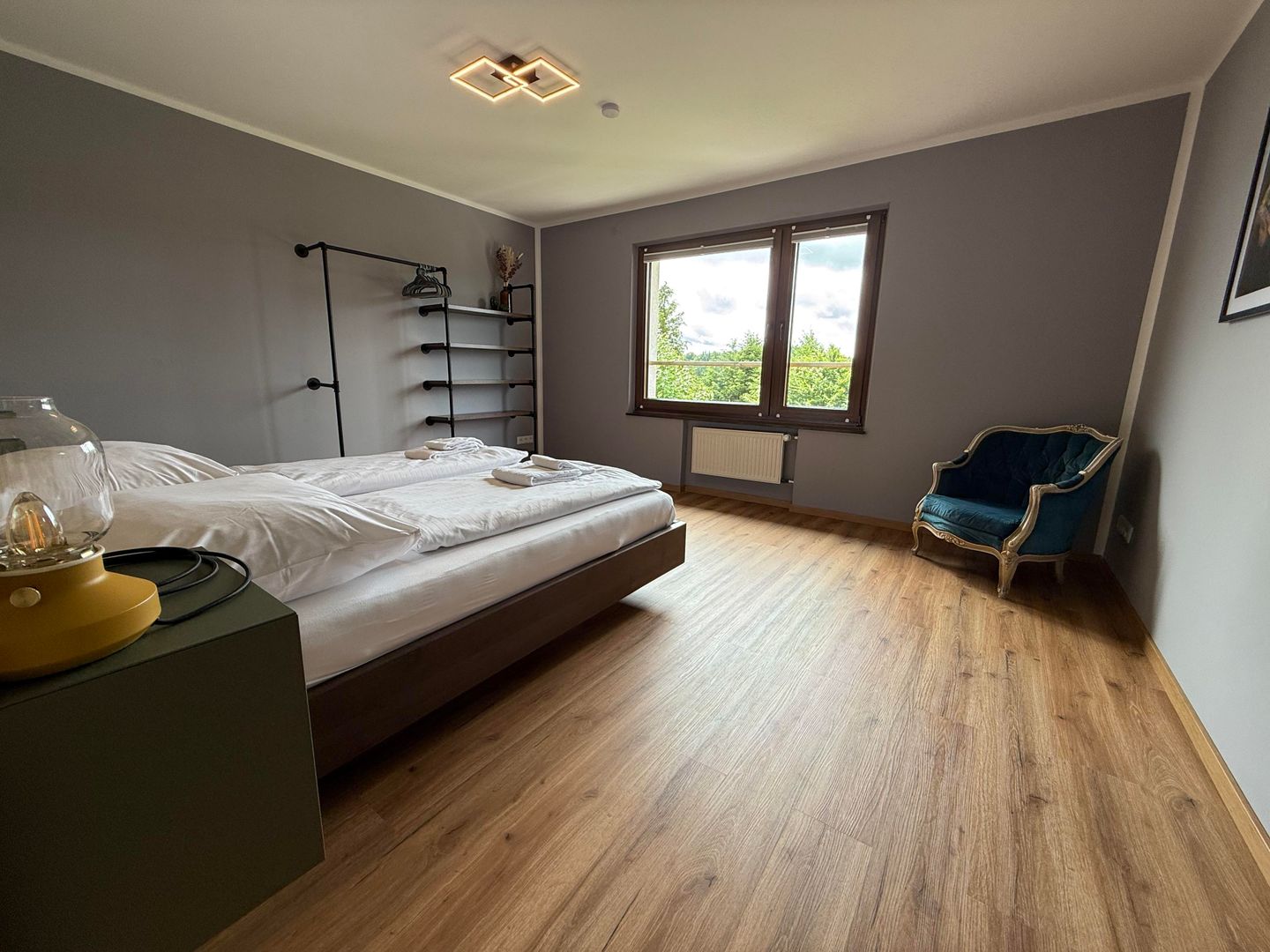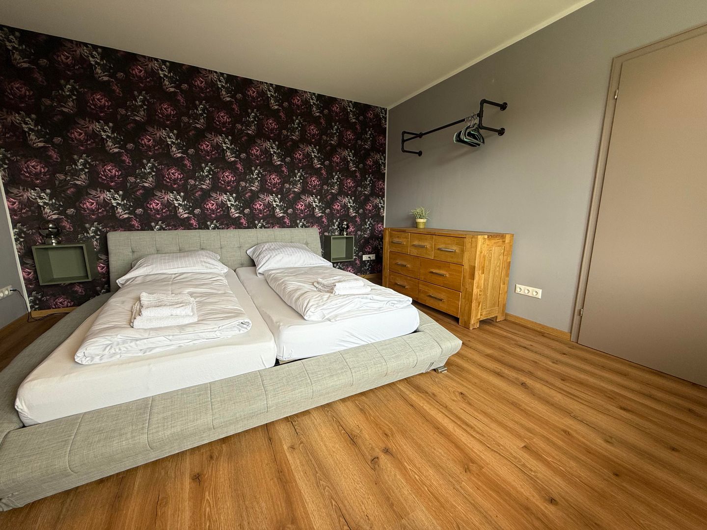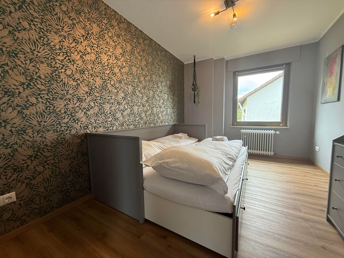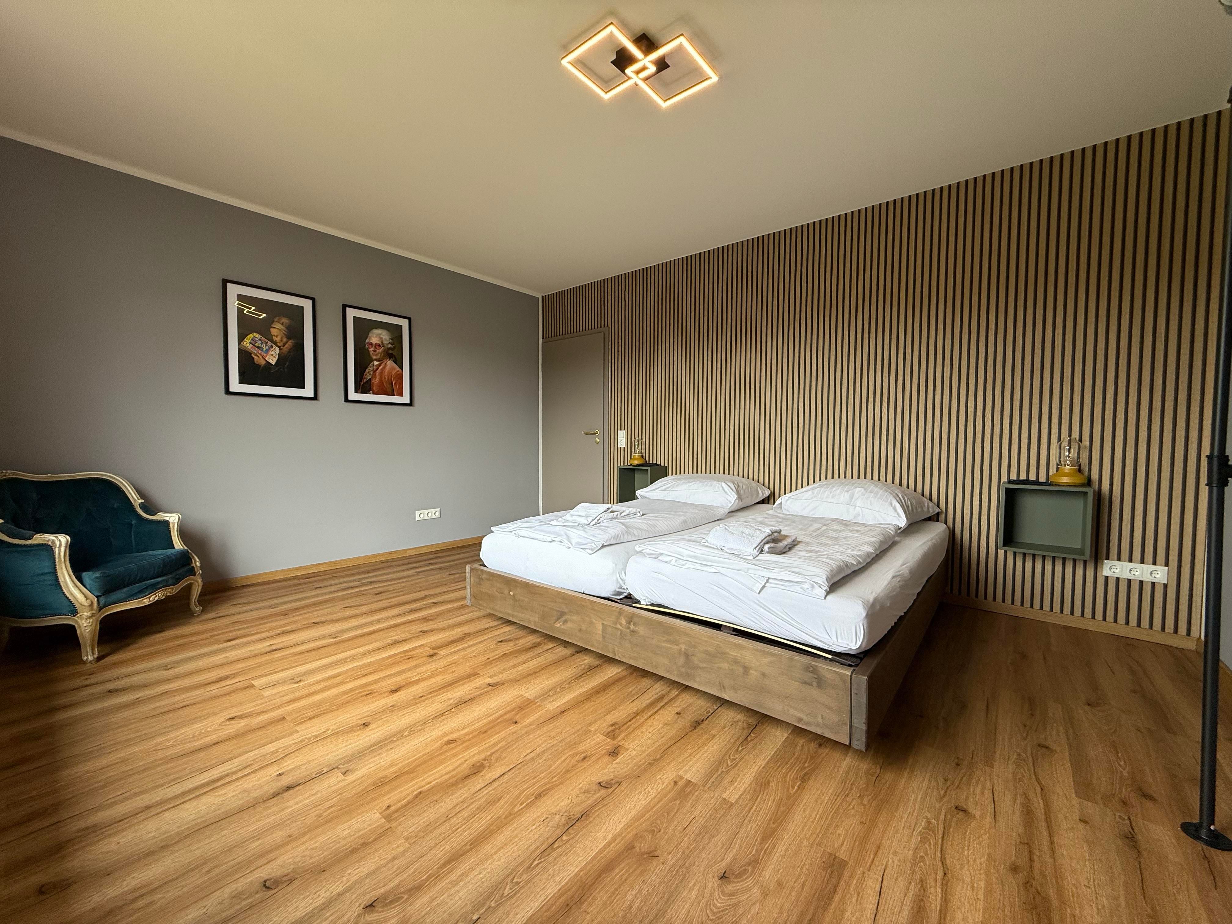 Im Obergeschoss befinden sich drei komfortable Schlafzimmer. Zwei Zimmer sind mit Doppelbetten ausgestattet und bieten einen herrlichen Blick ins Grüne. Das dritte Schlafzimmer verfügt über ein ausziehbares Bett. Alle Schlafzimmer sind mit Verdunklungsrollos ausgestattet.