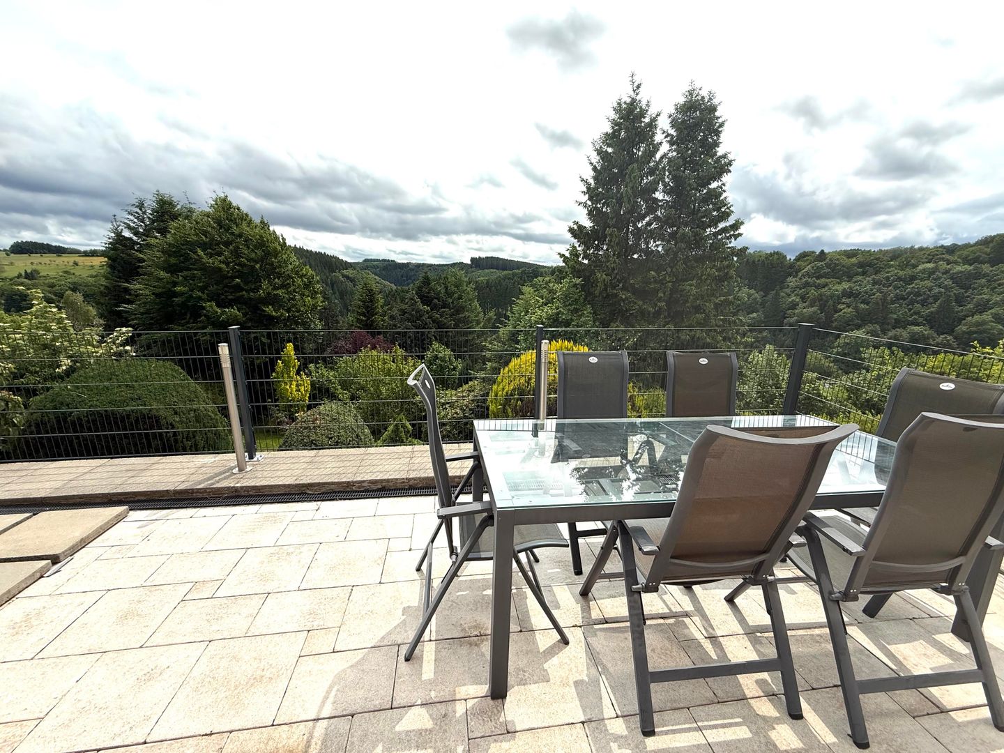 Die Terrasse ist direkt über die Eingangstür erreichbar und verfügt über einen großen Sonnenschirm sowie einen Glastisch mit 6 Sitzgelegenheiten. Von hier aus haben Sie Zugang zum Garten, der sich allerdings in Hanglage befindet. Die Terrasse ist der perfekte Ort für laue Sommerabende!