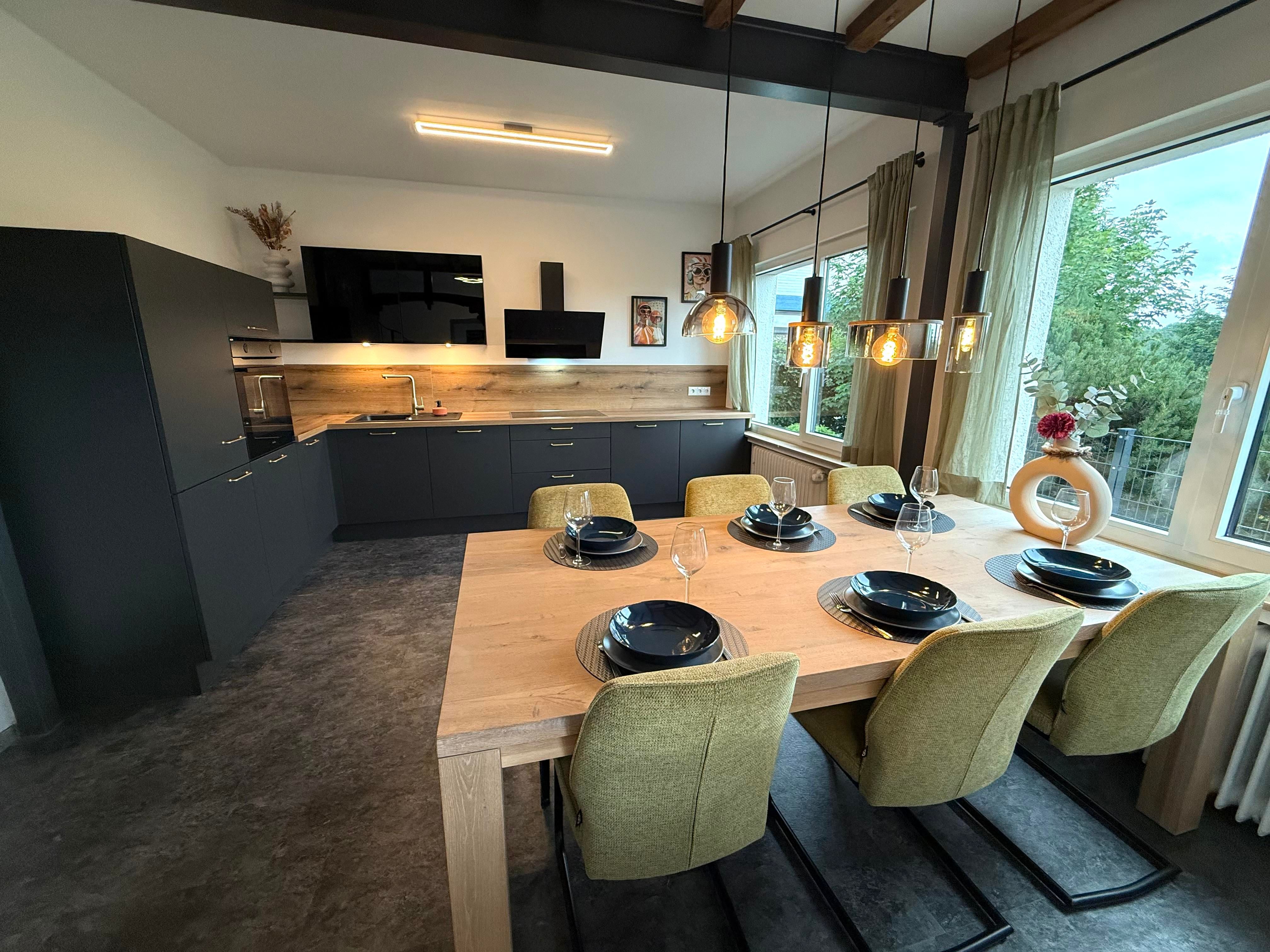Beim Betreten der Wohnung gelangen Sie in den Flur (inkl. Garderobe), der direkt in die großzügige Küche mit Essbereich führt. Der Esstisch bietet Platz für 6 Personen und bei Bedarf für ein Kind im Hochstuhl (auf Anfrage erhältlich). Die voll ausgestattete Küche verfügt über einen Kühlschrank, einen Gefrierschrank, eine Spülmaschine, ein 4-Platten-Induktionskochfeld, einen Backofen sowie eine Filterkaffeemaschine.