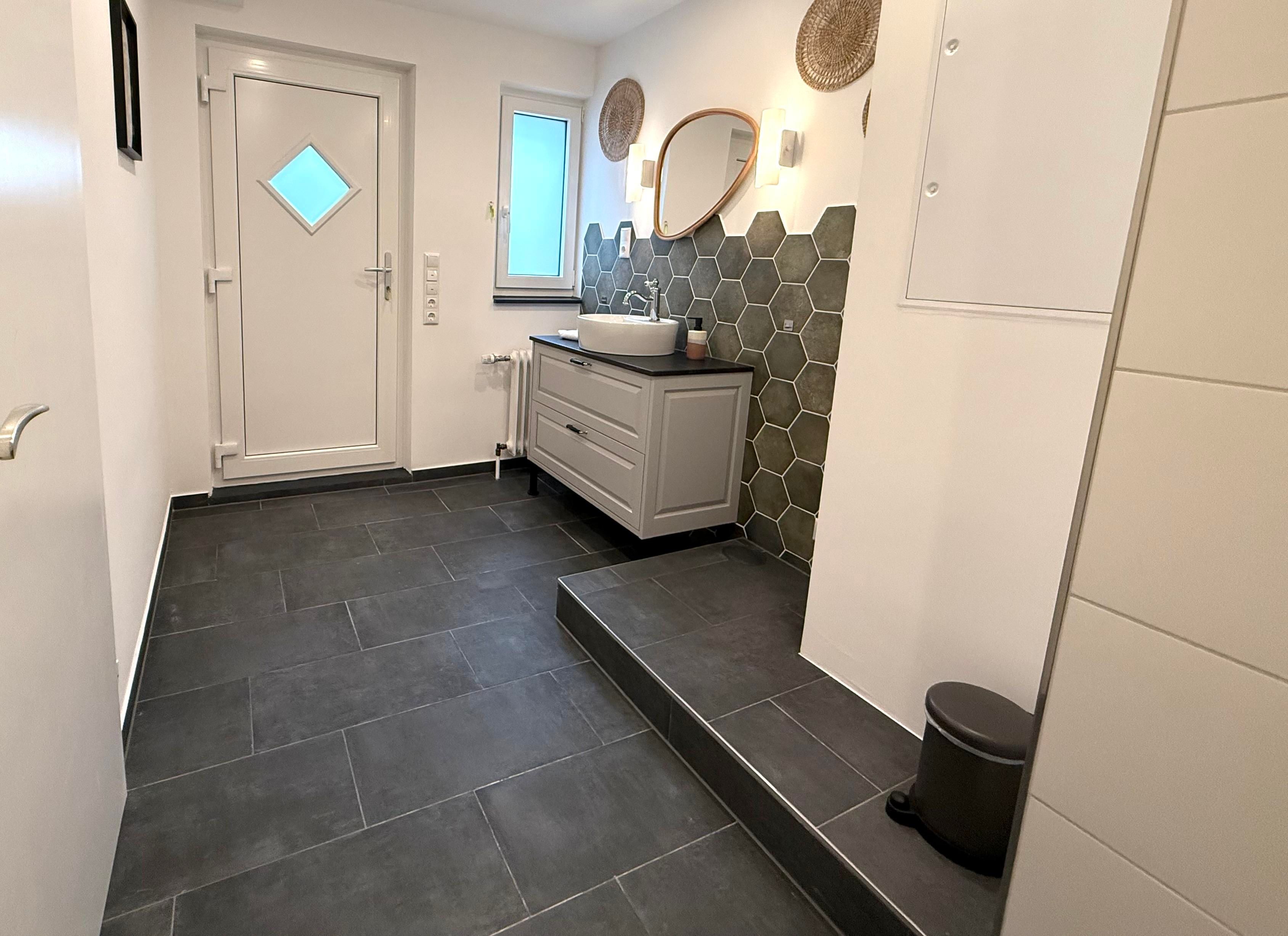 Das Badezimmer im Obergeschoss bietet eine geräumige Dusche, eine Badewanne und einen Einbauschrank. Ein Föhn ist ebenfalls vorhanden. Zusätzlich gibt es im Erdgeschoss einen Waschraum mit großzügigem Waschtisch und Toilette.
