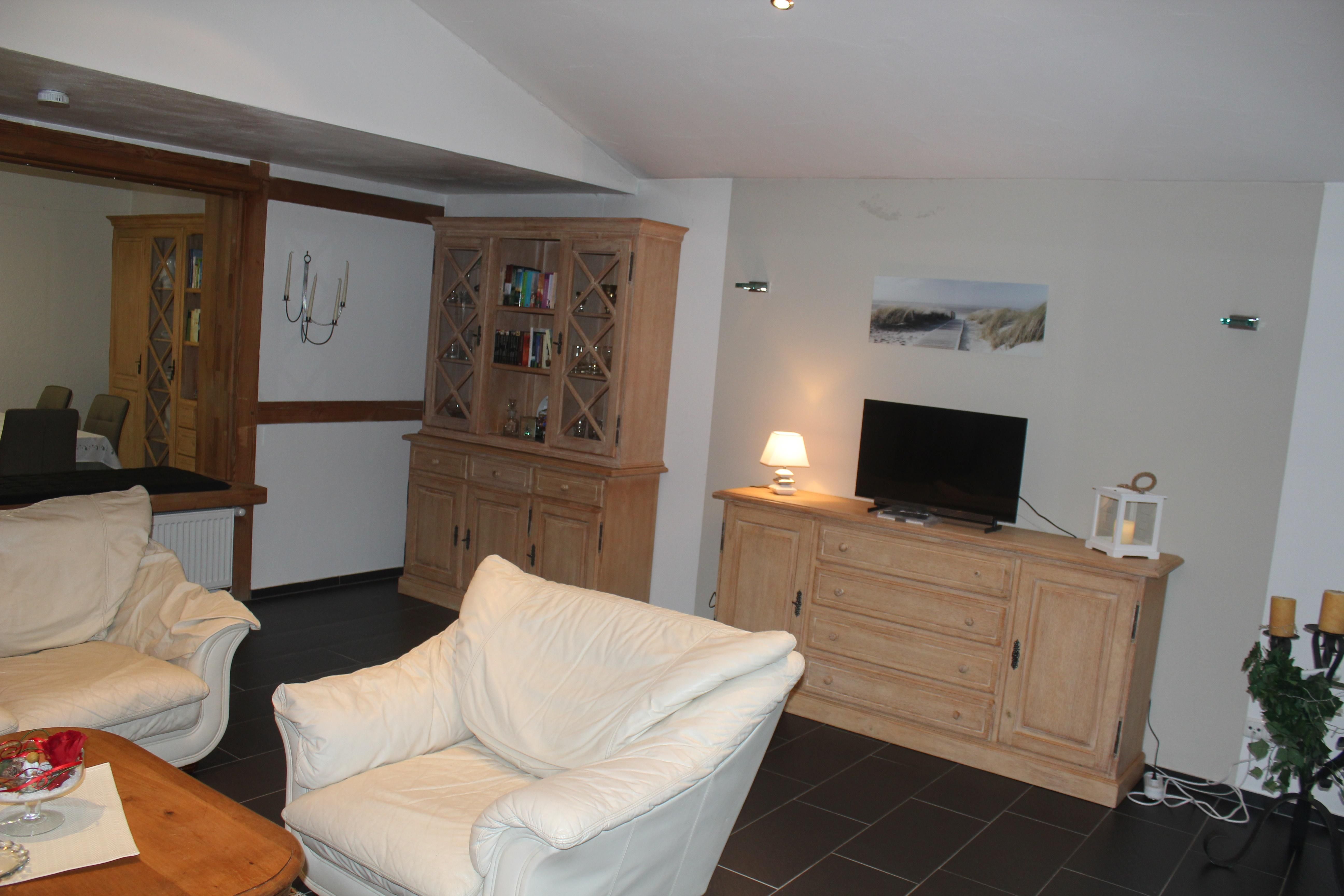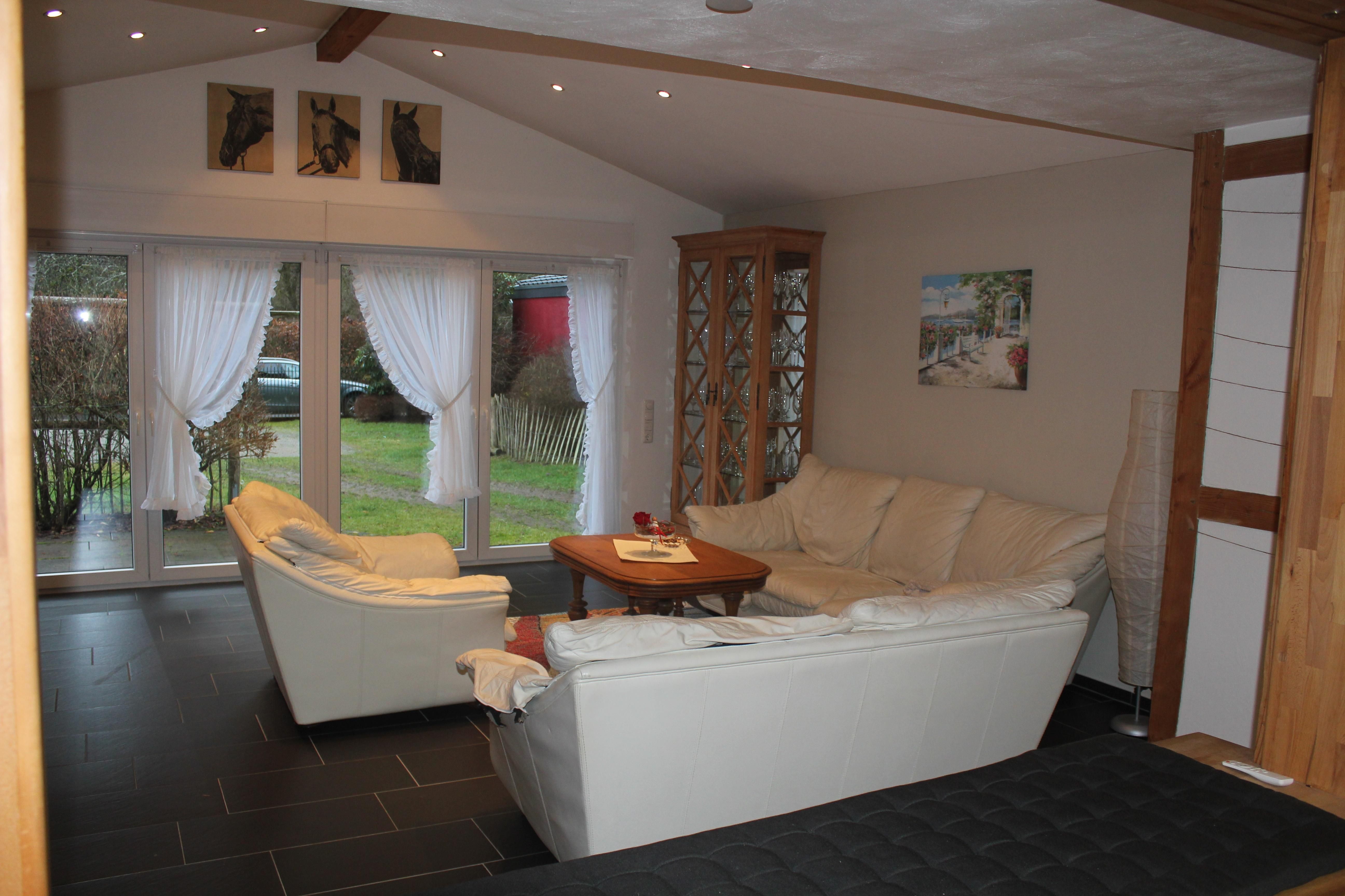 Im gemütlichen Wohnzimmer befinden sich zwei Sofas, ein Sessel und ein Flachbild-Fernseher. Das angrenzende Esszimmer verfügt über einen großzügigen Tisch mit 8 Stühlen.
