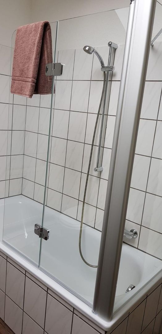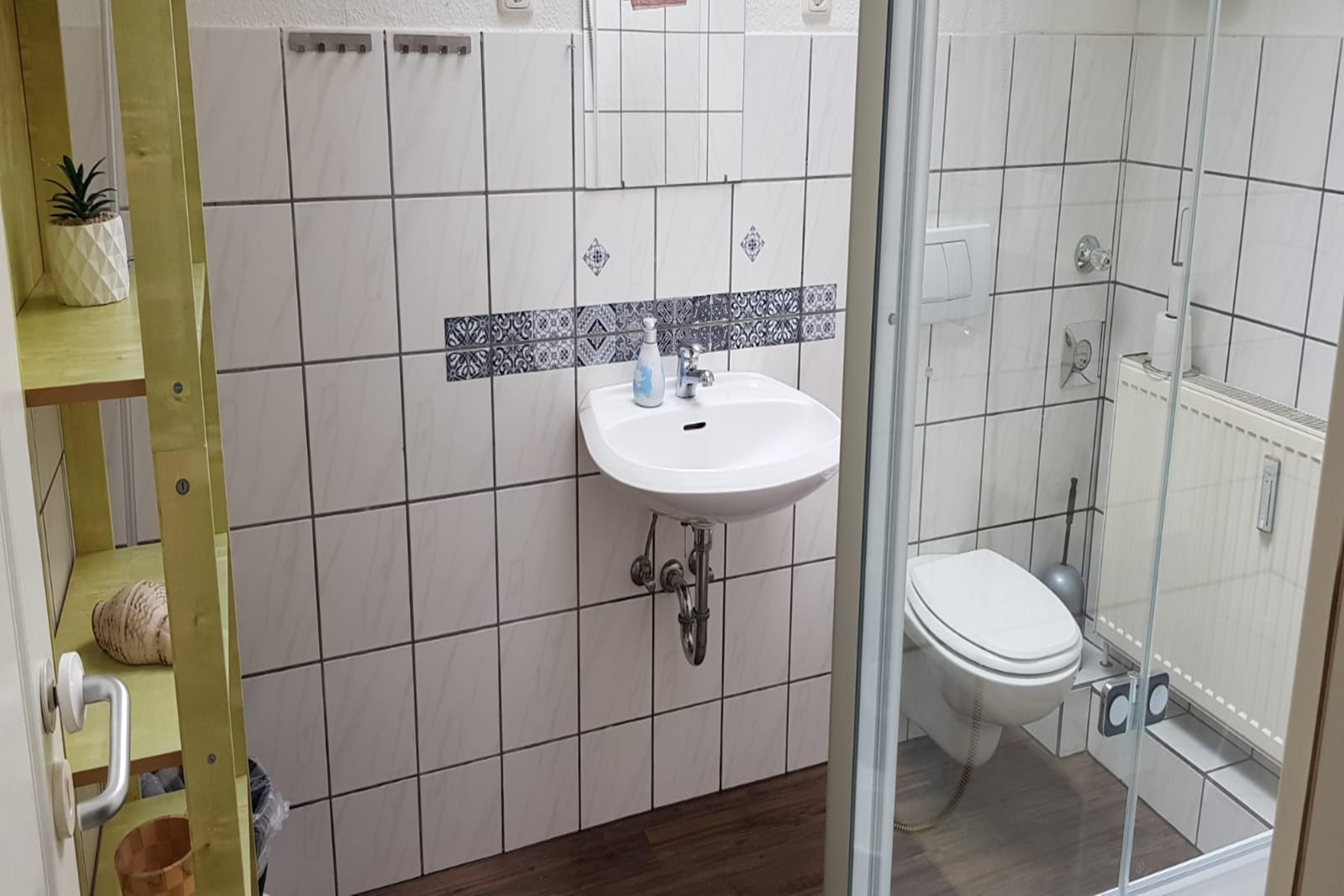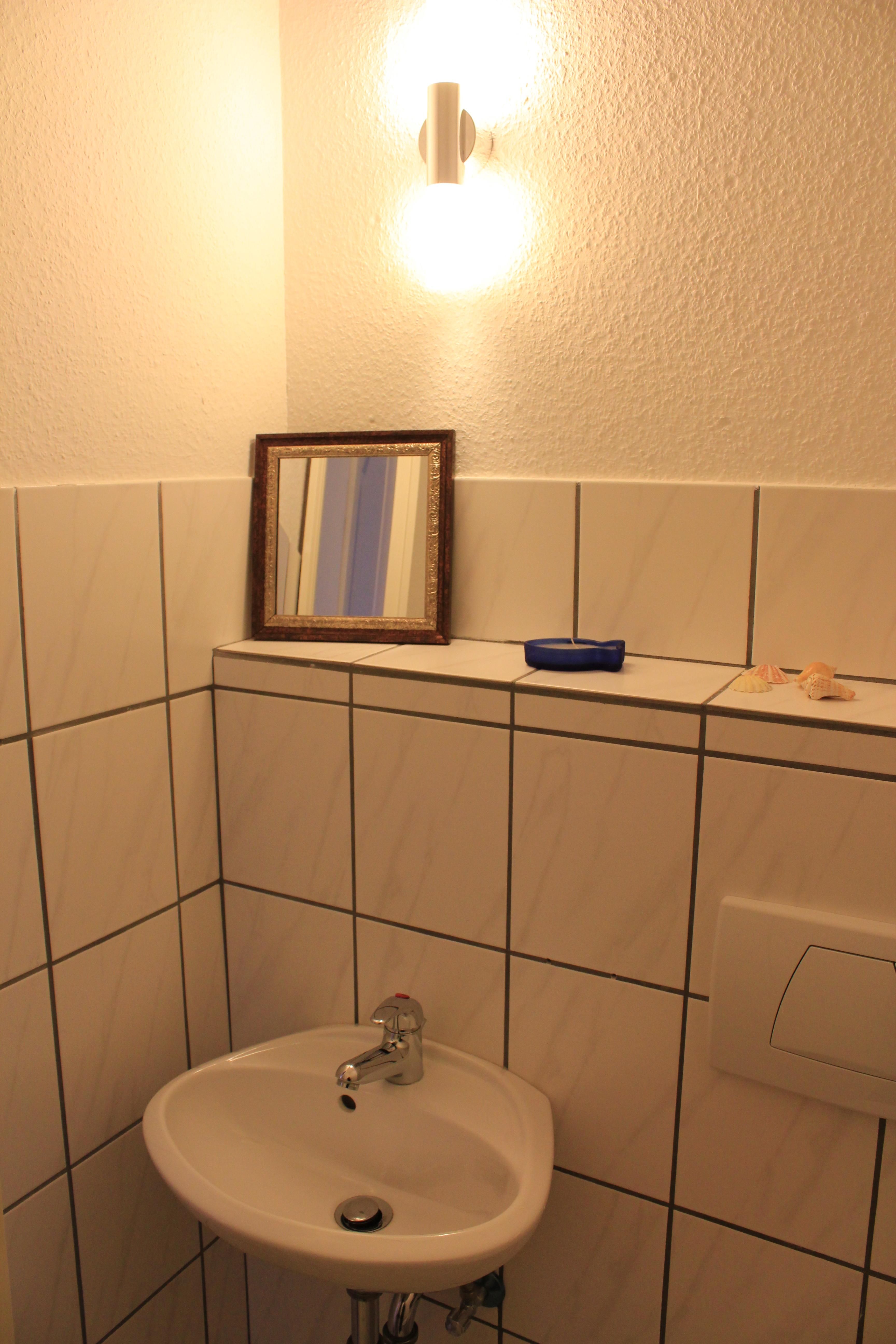 Es gibt ein Bad mit WC, Waschbecken und Duschwanne. Zusätzlich gibt es ein WC mit Waschbecken.