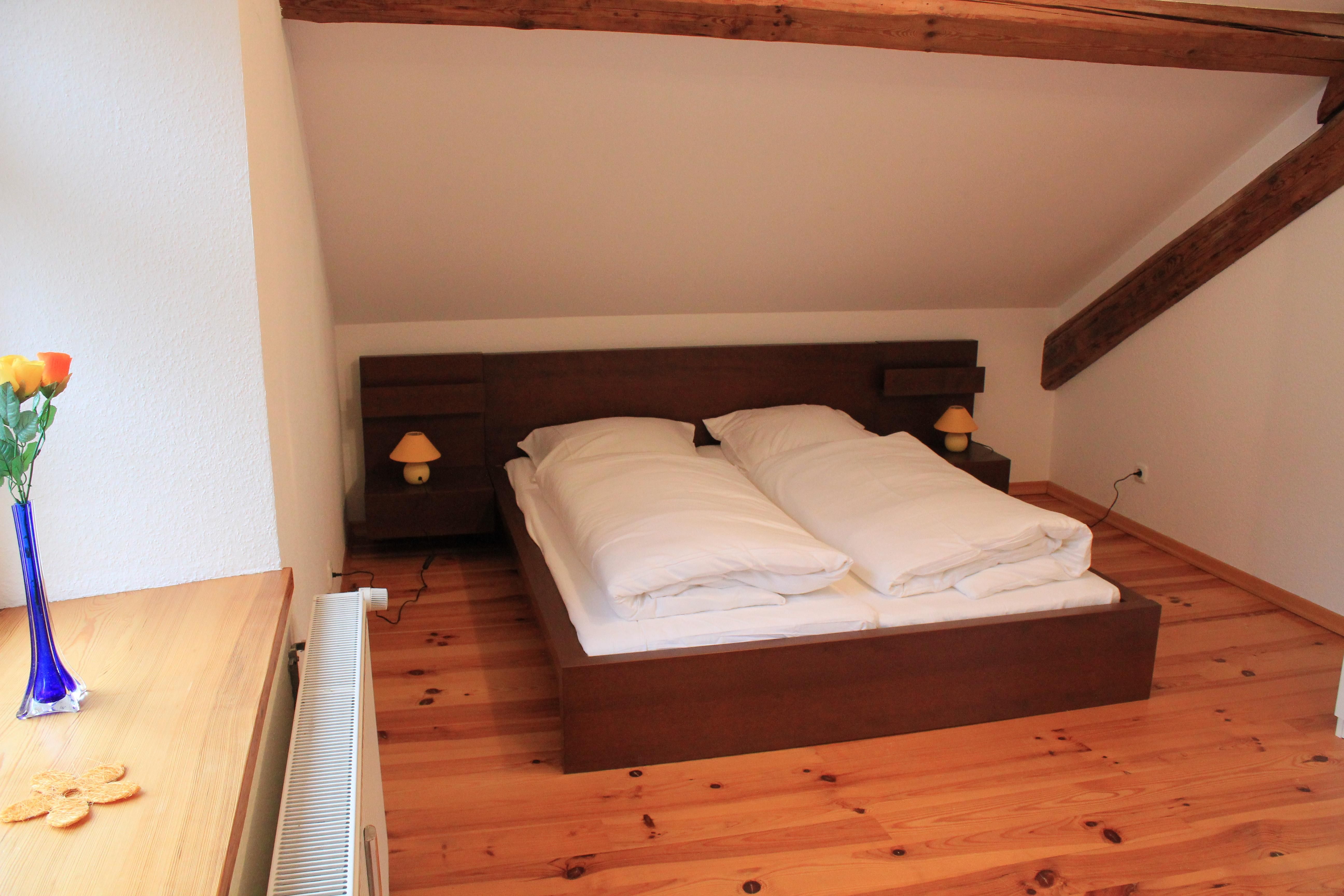 Im Schlafbereich gibt es zwei Doppelzimmer und ein Dreibettzimmer. Auf einer offenen Empore kann zusätzlich ein Klappbett aufgestellt werden.