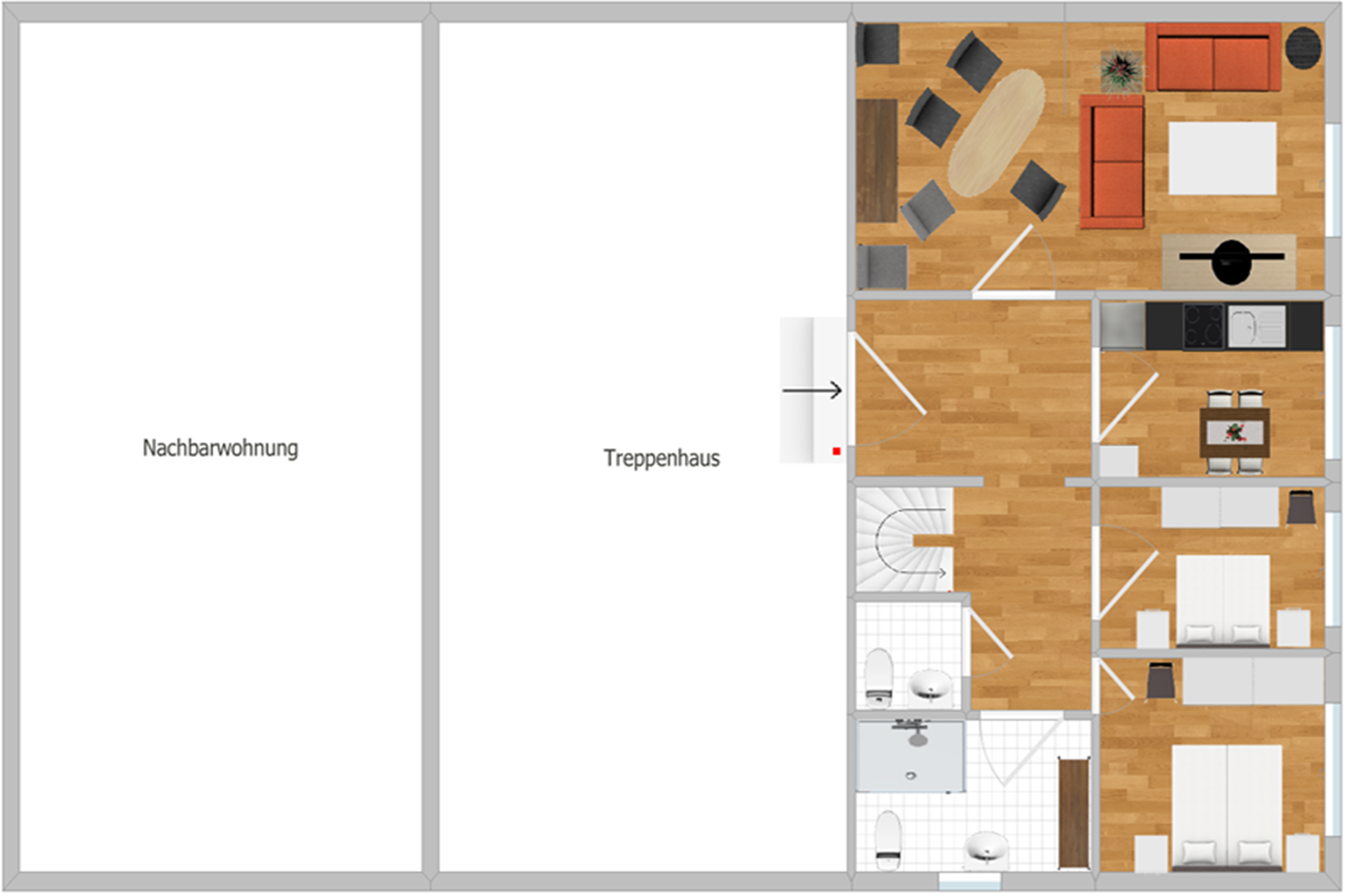 Es handelt sich um eine Maisonette Wohnung, mit einer Innentreppe für das Obergeschoss.